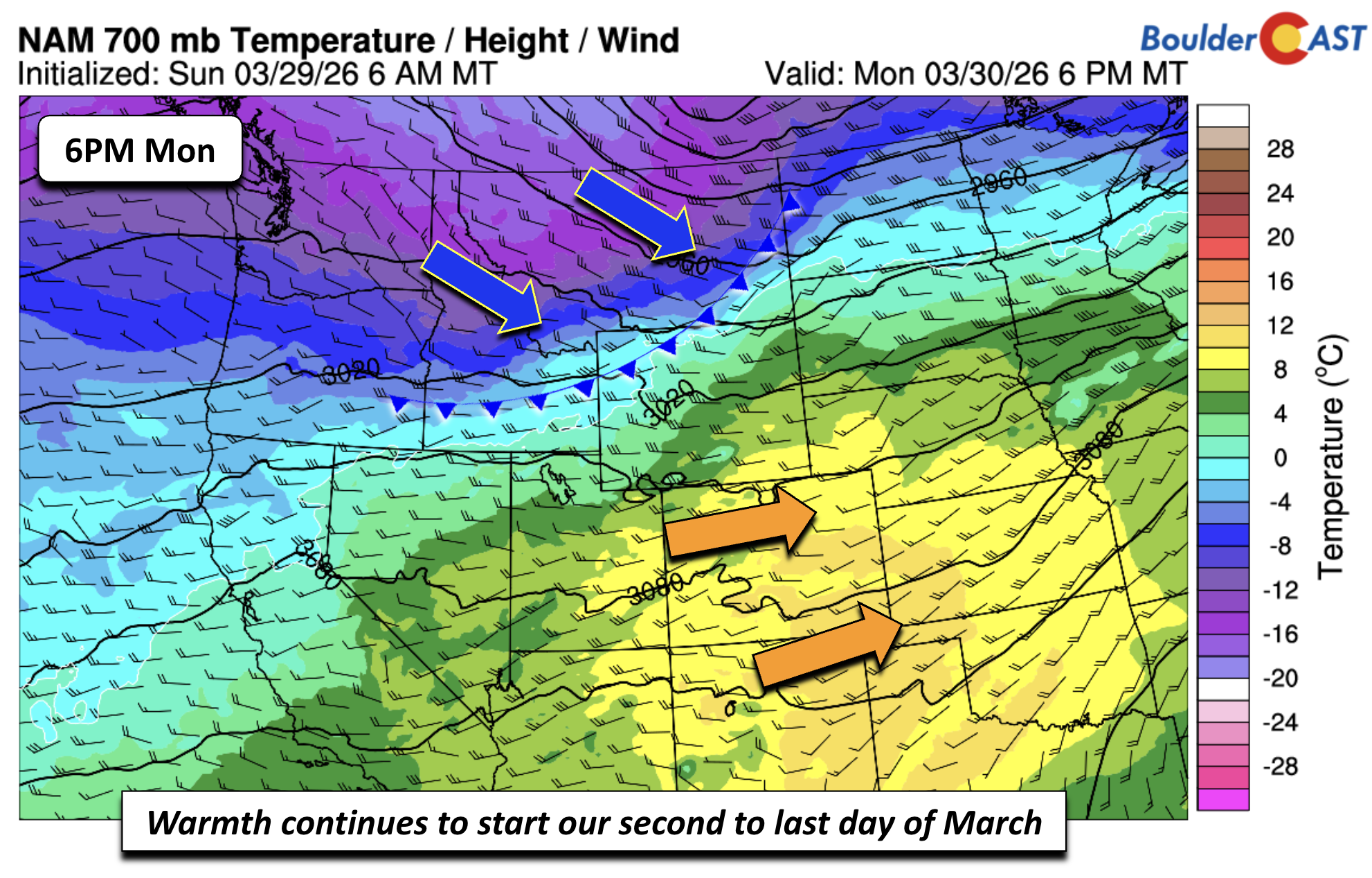 The anomalous weekend warmth will linger one more day into Monday, the second‑to‑last day of March. A warm westerly downslope pattern will persist through the afternoon, supporting another run at near‑80° temperatures. A cold front currently over northwest Wyoming is on track to arrive early Tuesday.