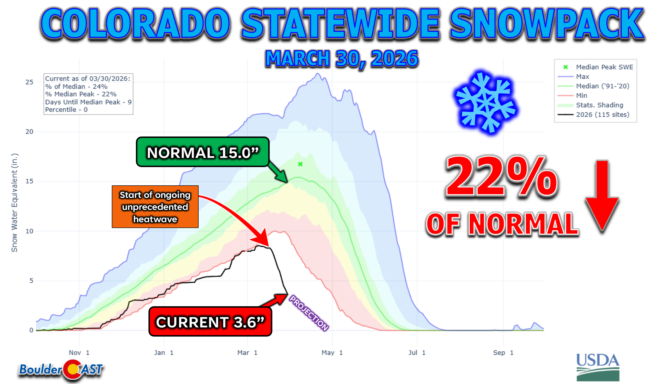 - 🏔️ Snowpack collapse now dire: Colorado’s statewide snowpack has plunged to 22% of normal, with most remaining snow only above 11,000 ft on favorable aspects.