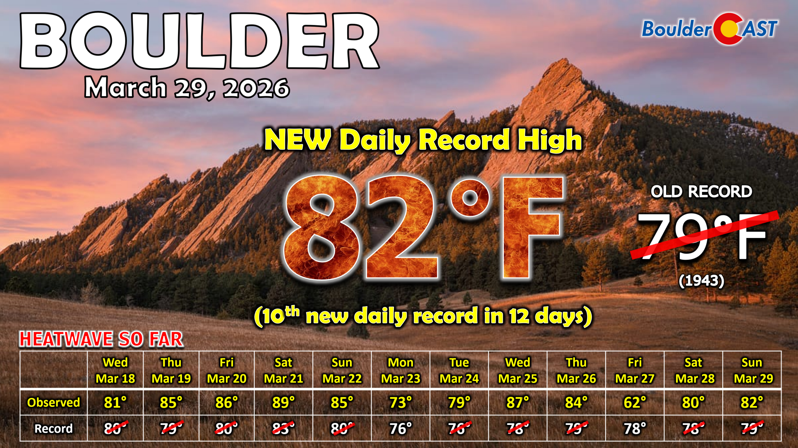 Sunday pushed the envelope further. Boulder reached 82°, toppling yet another daily record — the 10th record high to fall during this now 12‑day heatwave.