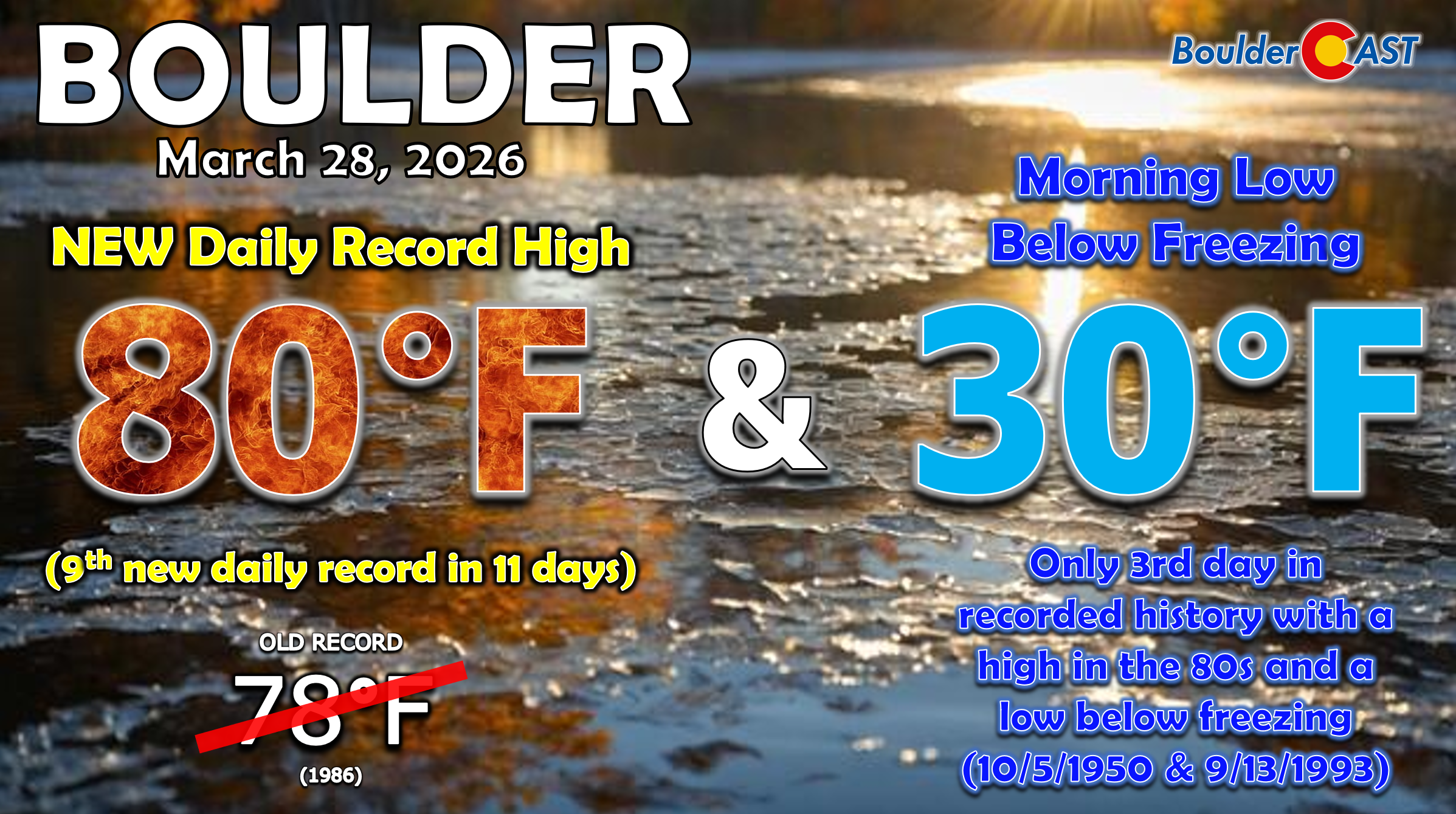 - 📈 Extreme temperature swing: Saturday featured a 50° diurnal jump and was only the third time ever Boulder has gone from below freezing to the 80s in a single day.