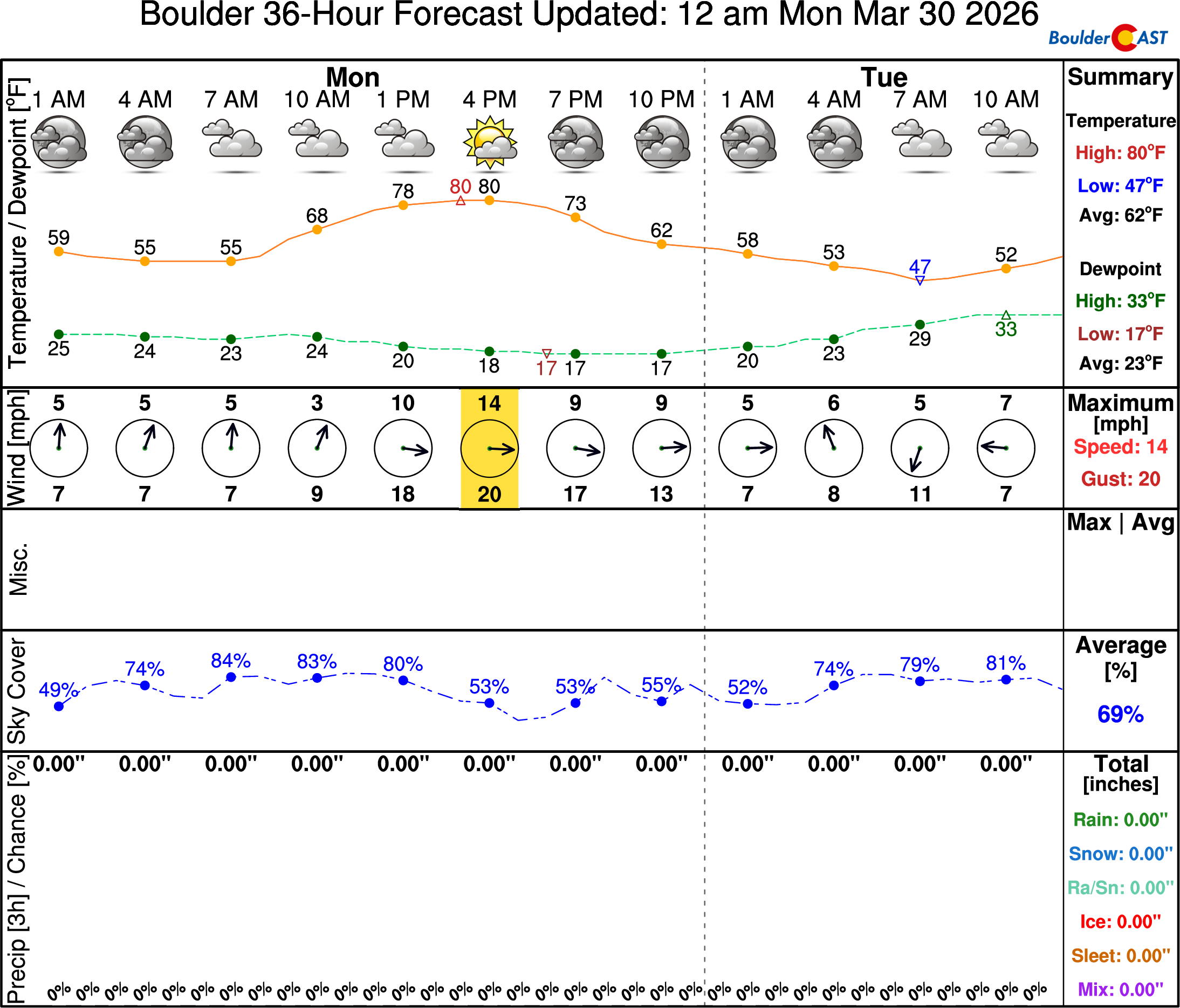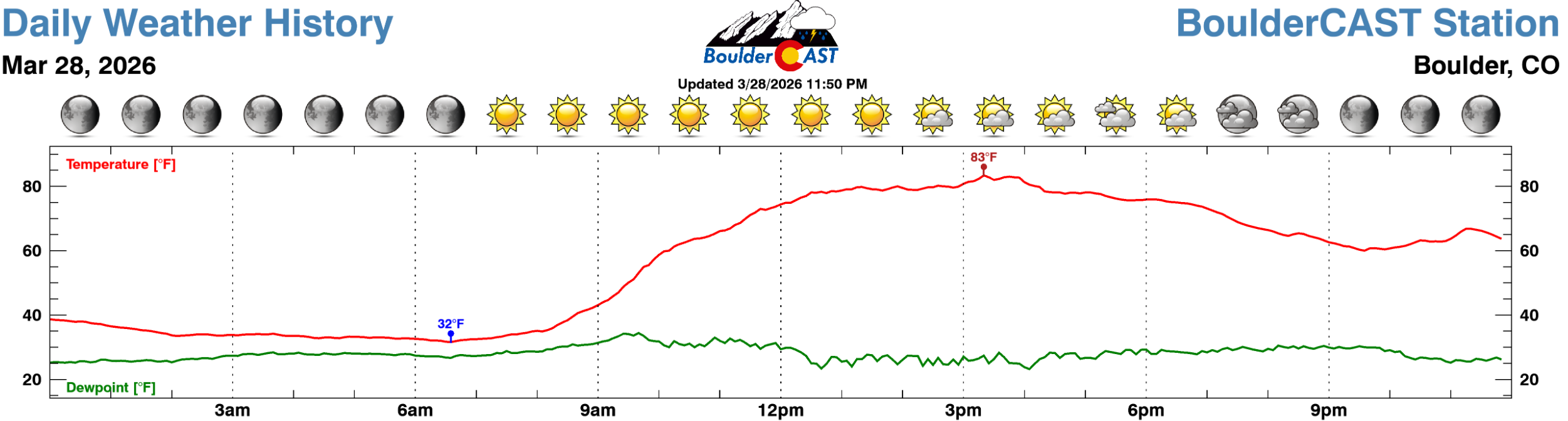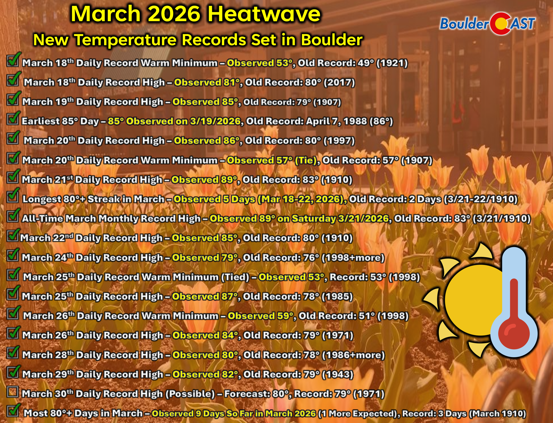 The unprecedented Southwestern heatwave rolled straight through the weekend, delivering yet another round of record‑setting temperatures along the Front Range. Boulder hit 80° on Saturday, breaking the previous March 28th record of 78°. Even more remarkable: Saturday became only the third time in recorded history that Boulder began the day below freezing and still surged into the 80s. The official low was 30°.
