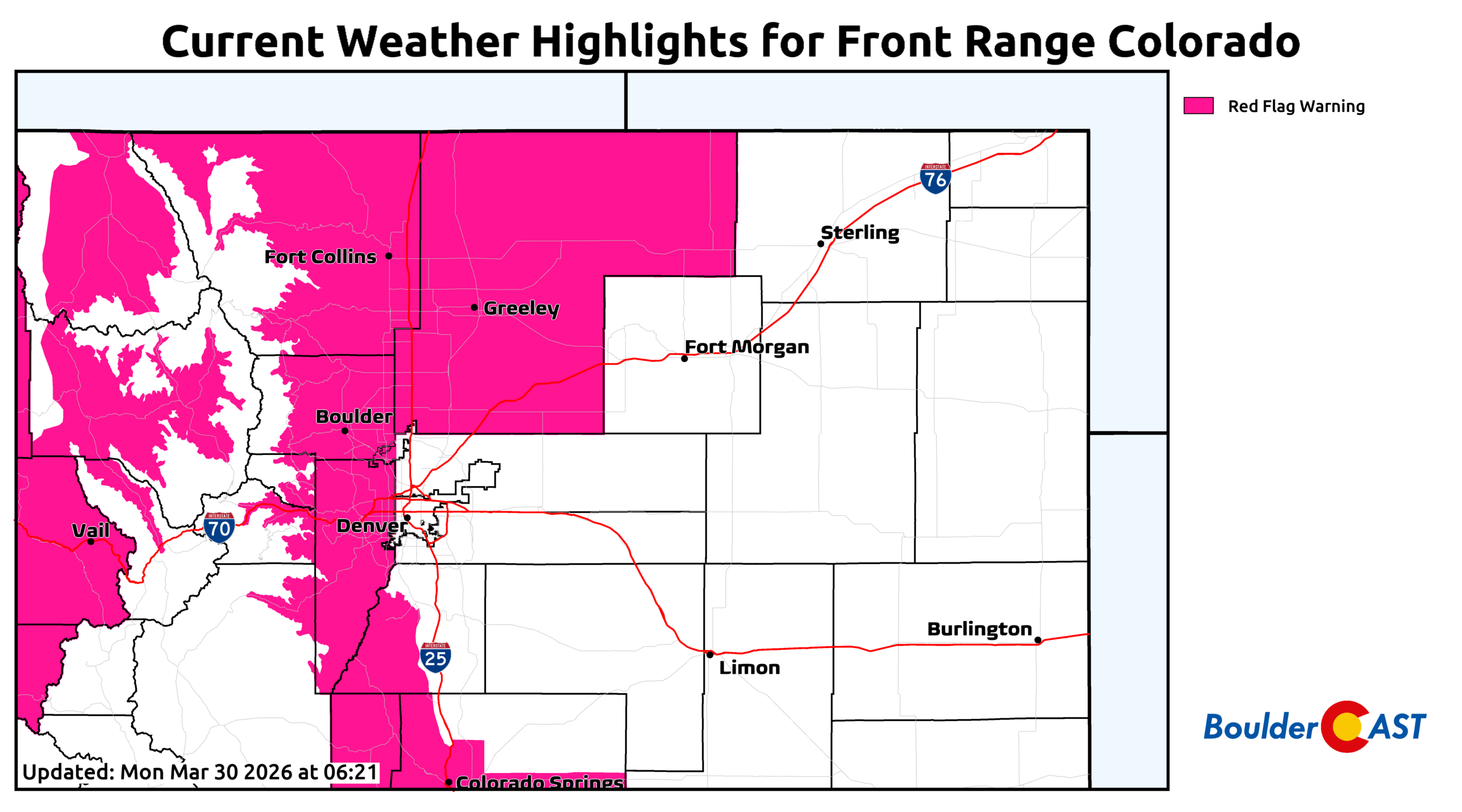A Red Flag Warning is in effect from 11 AM to 8 PM Monday for portions of the Front Range, including Boulder, Fort Collins, and the Foothills. Fire‑weather discipline is essential today!