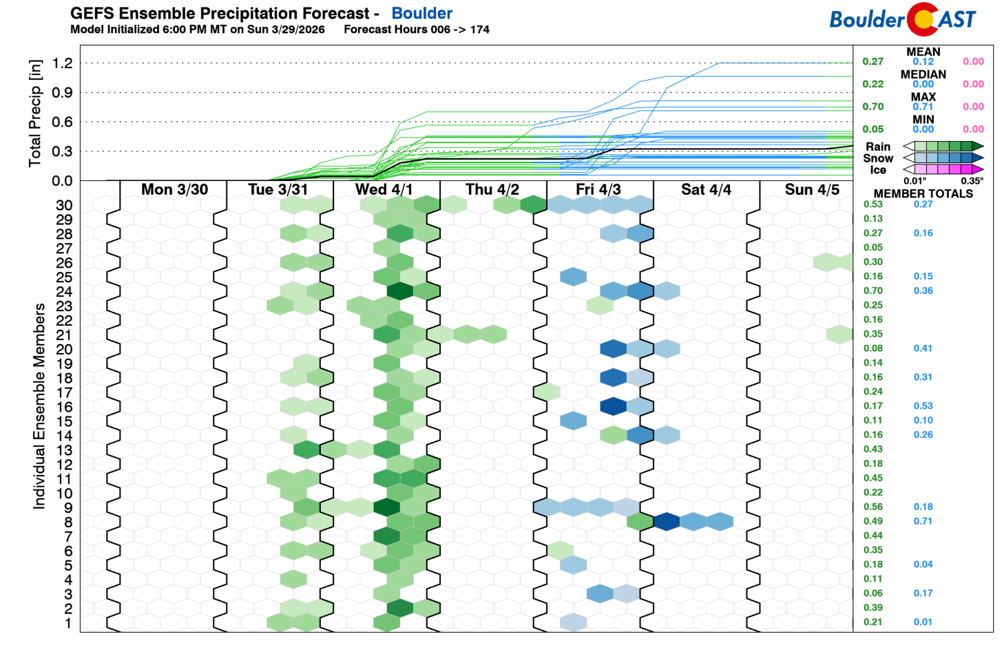 The GEFS ensemble plume shows midweek precipitation clearly, but Friday–Saturday solutions are split: roughly half the members are dry, while half show rain or snow.