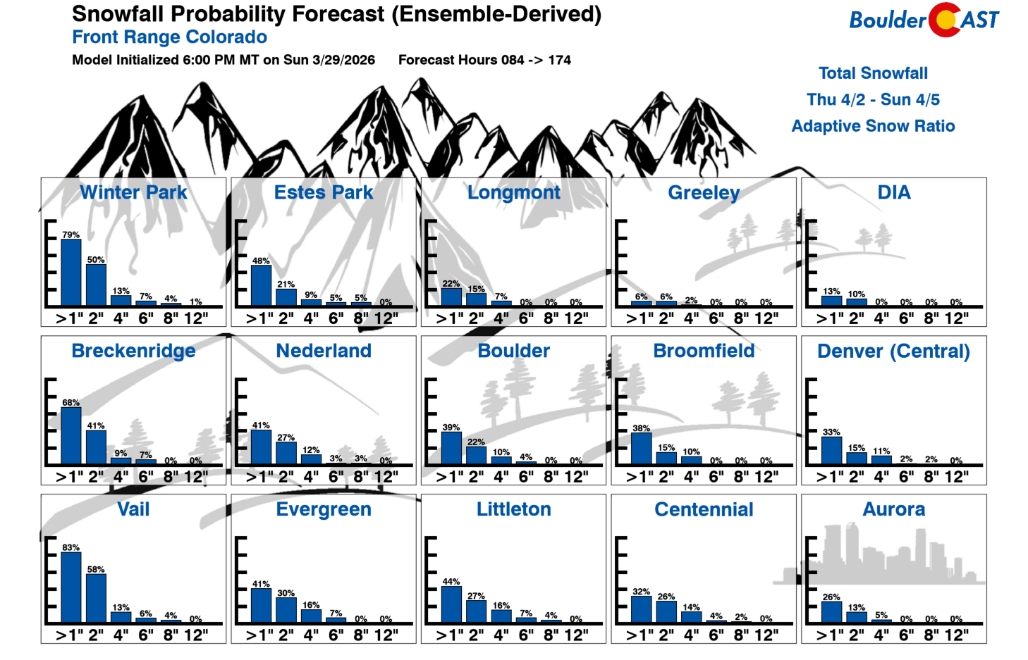 Our snowfall probabilities remain fairly low — only 25–40% chances for at least 1 inch of snow accumulation in Boulder/Denver — with higher odds in the Mountains.