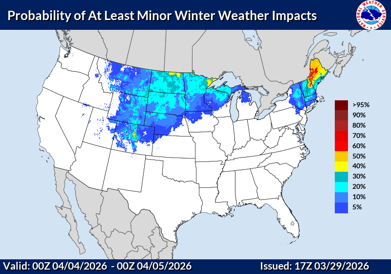 Bottom Line: Confidence remains low for late‑week precipitation, but the setup is worth monitoring — especially given our desperate need for moisture. The Weather Prediction Center currently shows low‑end probabilities for minor winter impacts in the Boulder–Denver corridor. Whether it ends up being rain or snow, any precipitation would be beneficial.