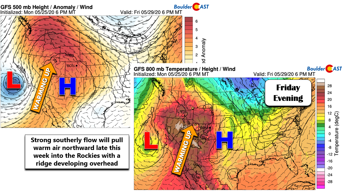 A warm-up is likely to take hold late in the week as strong southerly flow ramps up into Colorado aided by a tight low pressure system coming ashore into California.