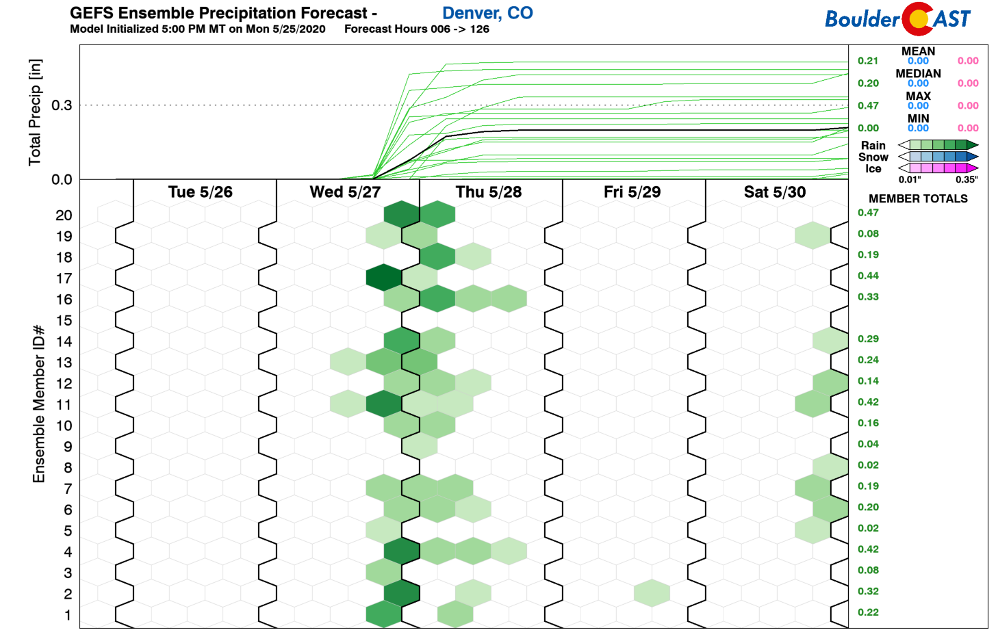 One look at the precipitation forecast from the GFS ensembles for the next five days and we see that Wednesday evening into Thursday morning will offer our best chance of rain for the week.