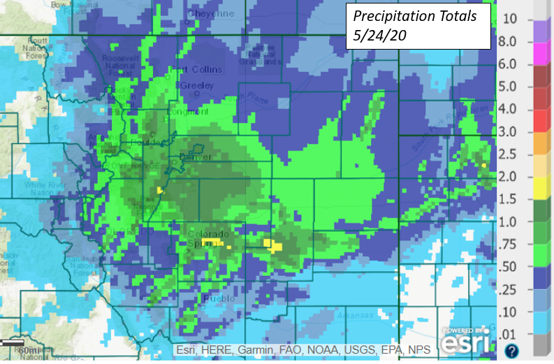 opefully you planned your elongated weekend accordingly and were prepared for a the cold and wet weather this past Sunday. Luckily the holiday weekend was book-ended by two pleasant, mostly dry, and sunny days to make up for it! Observations show that 0.75″ to 1.25″ of precipitation was reported across the entire Front Range from Colorado Springs to Fort Collins.