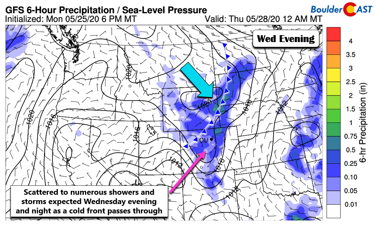 What’s happening on Wednesday? A weak piece of energy embedded in the northwest flow is progged to move across Colorado and help fire off a few late-day showers and storms. Both before and after this, however, a ridge of high pressure will be in control across the area leading to fairly nice weather, particularly later in the week.
