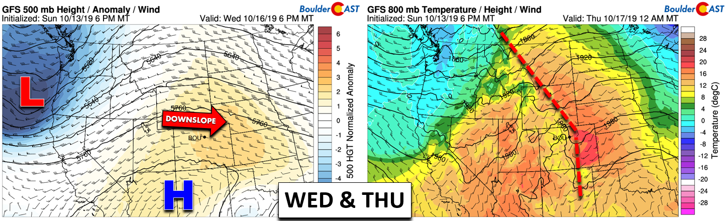 By mid-week, the aforementioned weak storm systems will have pushed off to the east with flow turning west-southwesterly across the area as a ridge of high pressure builds into the Four Corners area. This will lead to a quick warm-up as dry downslope flow takes hold as early as Wednesday morning. The resulting warm-up on the leeward side of the Rockies is visible in the 800 mb temperature map for Wednesday shown below on the right. Note the lee trough signature (dips in the contoured height lines). Temperatures on Wednesday will push back into the upper 70’s to near 80 degrees with a mix of sun and wave clouds. Thursday will be similar overall, though with likely slightly warmer temperatures and greater wave cloud coverage. Given just how dry this flow will be, fire weather concerns will be elevated across the Mountains both days.