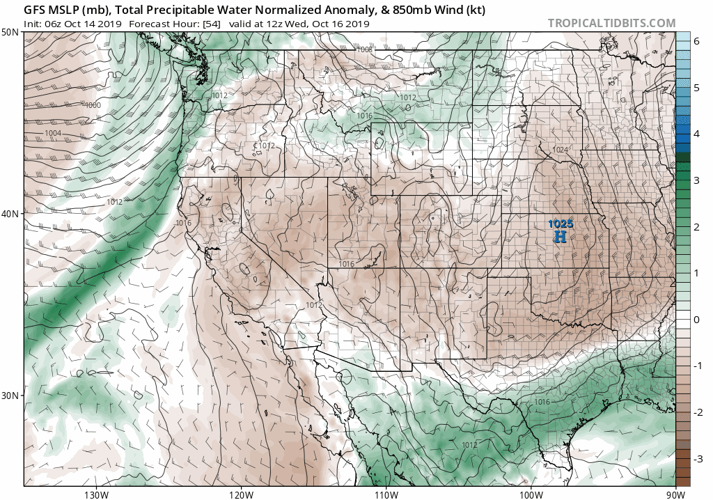 It’s not all fun in the sun this week! While a ridge of high pressure will pass across Colorado on Wednesday and Thursday, the next Pacific storm system will be entering the Pacific Northwest Wednesday night (above on the left). This trough will be sharper and have more embedded Pacific moisture as it moves across Colorado. Below is an animation of forecast moisture anomaly Wednesday through Friday night. Watch as the wave of green (elevated moisture) progresses through our area.