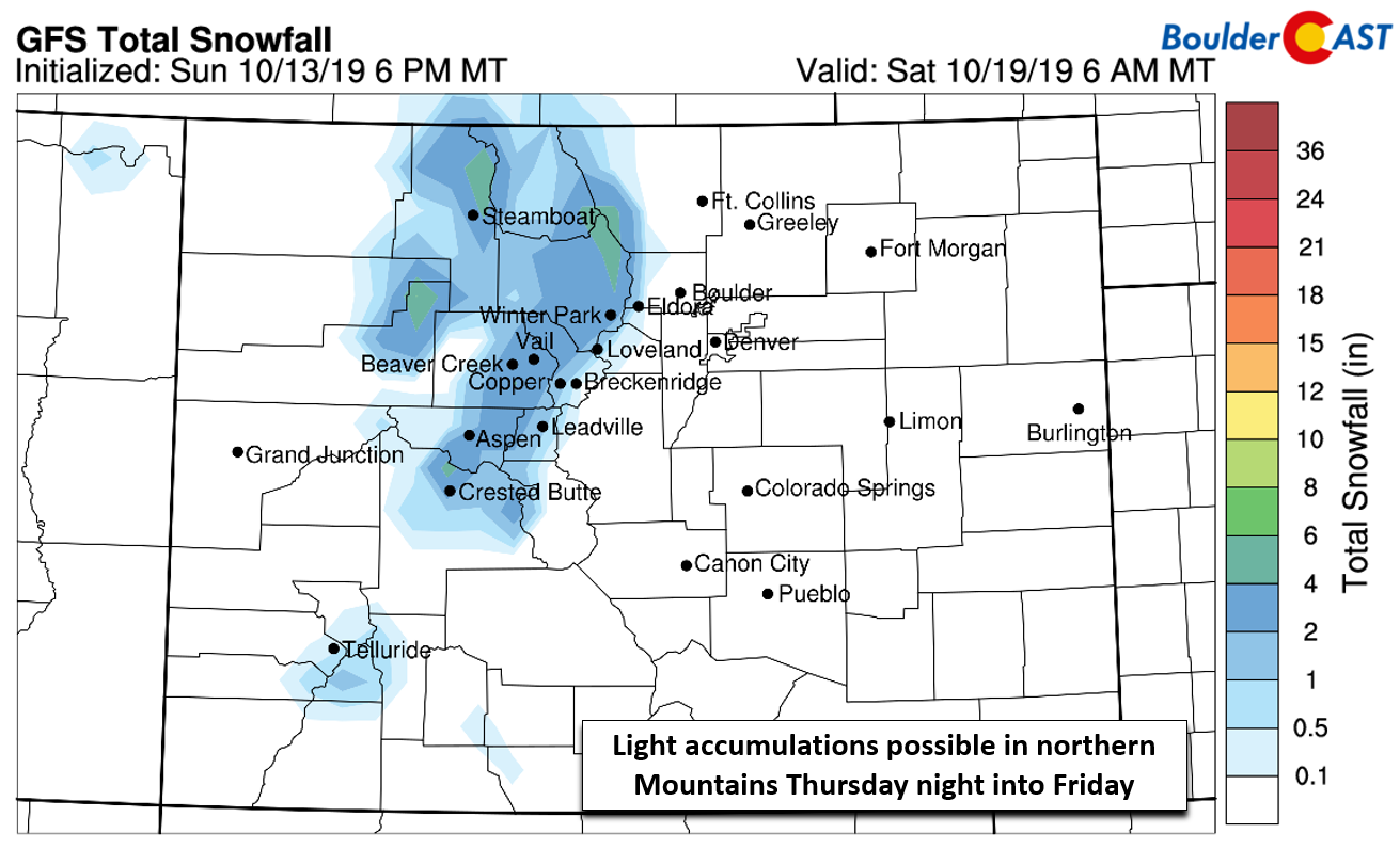 This late-week storm system should bring light snowfall to the Mountains, especially north of Interstate 70 and for areas favored by northwest flow. The latest runs of the GFS and Euro models are showing 2 to 5″ for many ski resorts. While this is nothing really to write home about, it’s nice to mix a little real snow in with the man-made stuff.