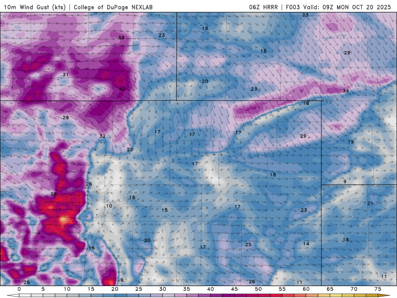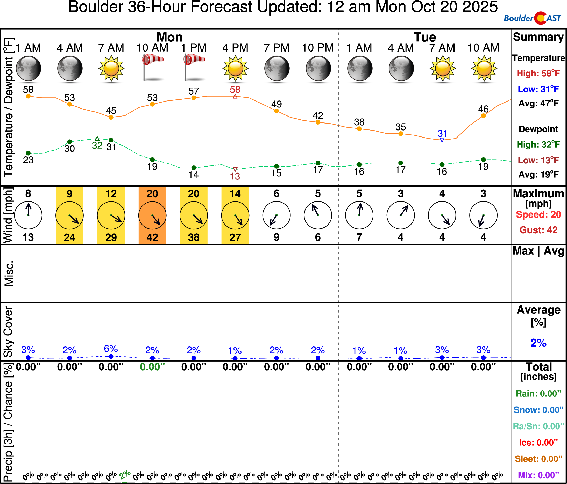 Gusts of 30–50 MPH will be widespread, with isolated peaks up to 75 MPH possible in classic wind-prone zones like southwest Boulder, Rocky Flats, and Golden. Winds will peak in the morning, stay blustery through the afternoon, and ease off toward sunset.