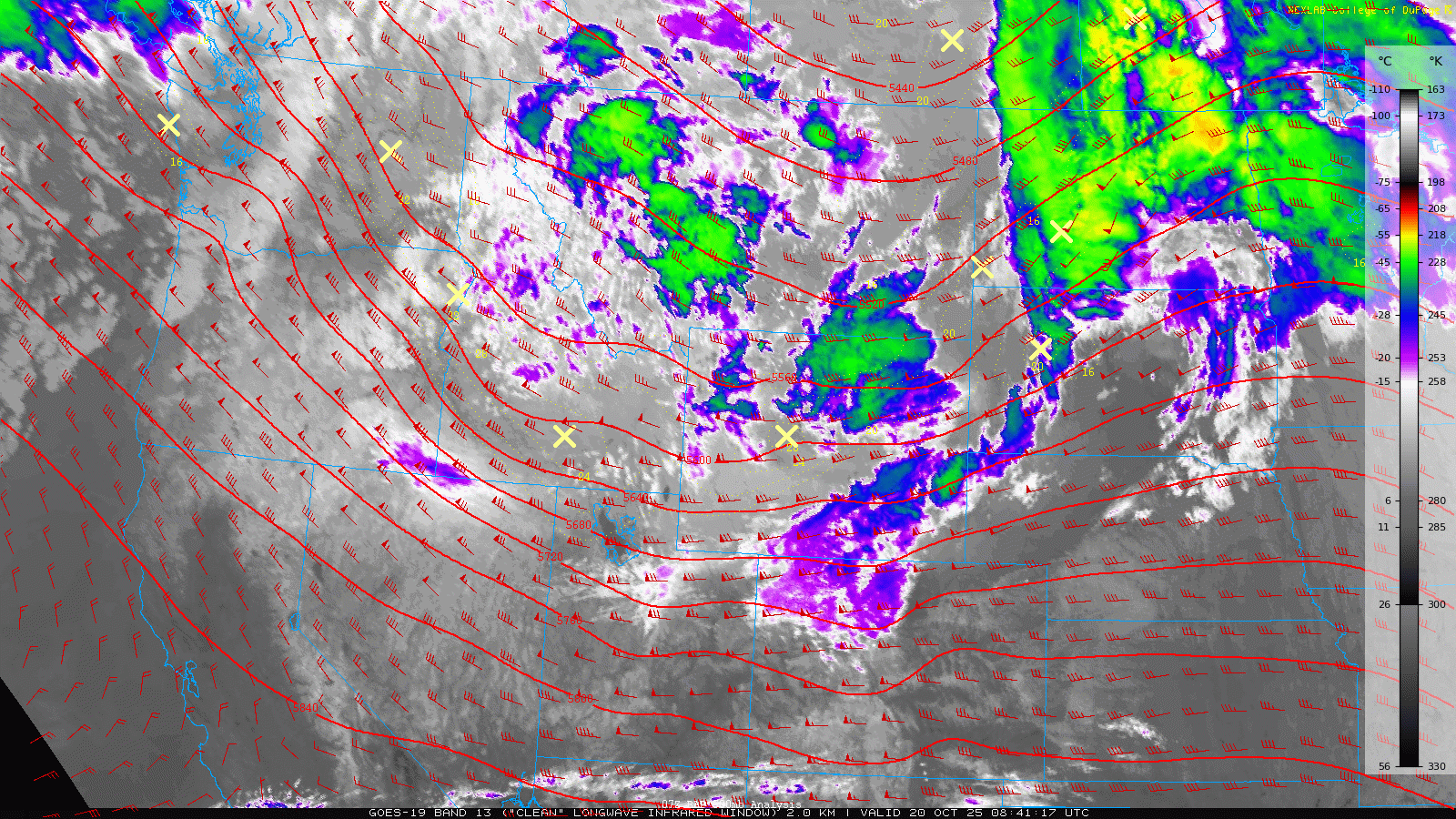 As of Monday morning, a strong autumn storm system is sweeping through the northern Rockies, anchored by a broad upper-level trough. Infrared satellite imagery shows a well-defined band of clouds and precipitation pushing into Colorado’s high country from Wyoming. Meanwhile, a cold front is surging south across eastern Colorado, visible as a subtle dark streak on the satellite loop just before sunrise.