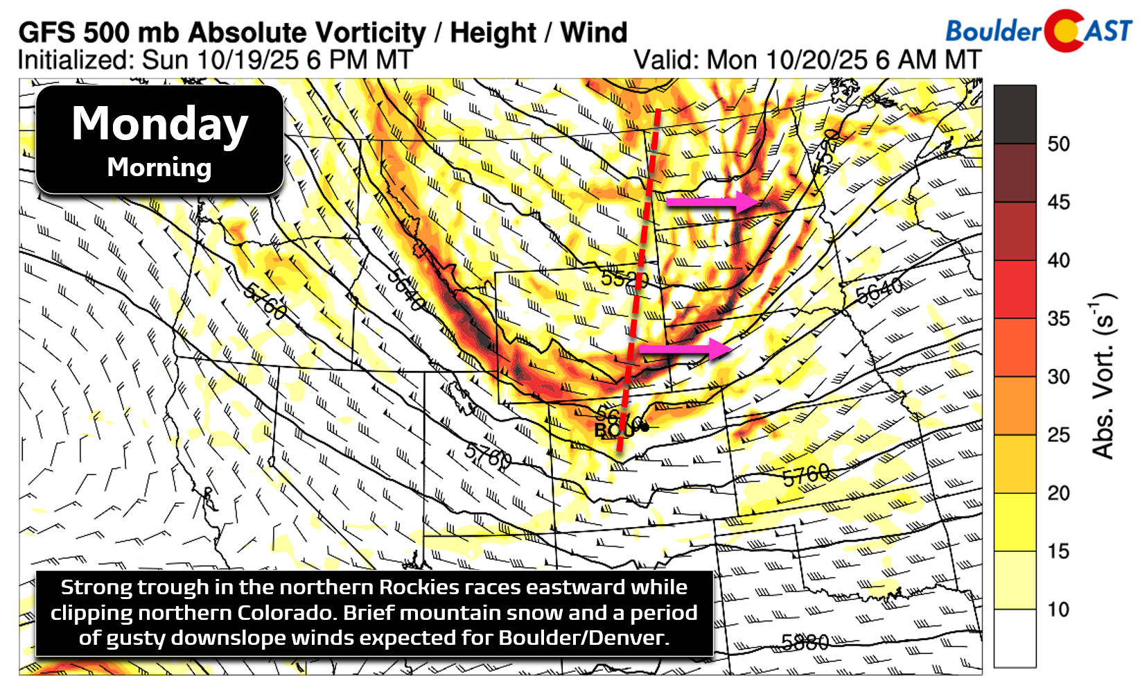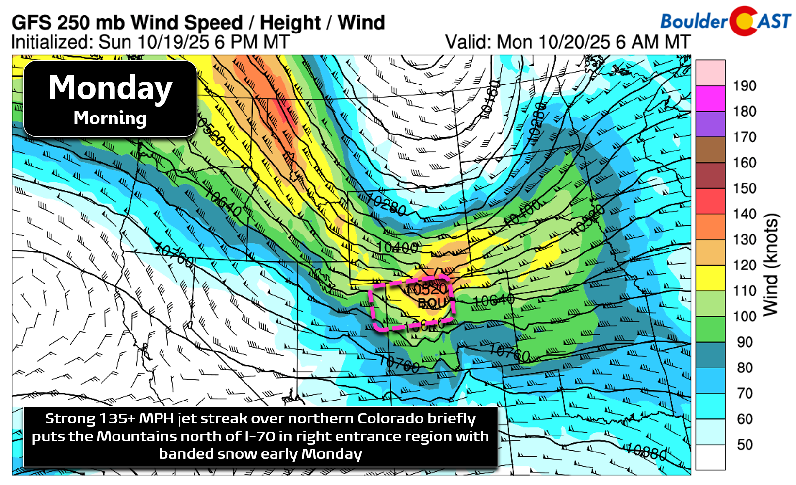 Embedded in the trough is a powerful jet streak, clocking over 135 MPH aloft, racing across northern Colorado. Its right-entrance region, paired with the frontal push, will spark a brief burst of banded snow in the Mountains early Monday.