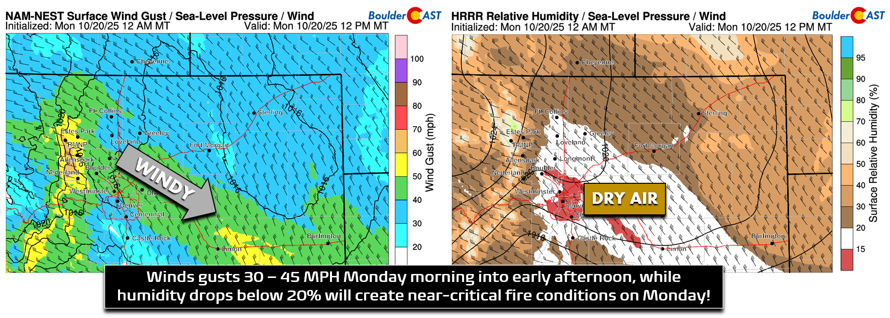 - 🔥 Critical Fire Setup Monday: The storm’s dry slot and subsidence behind it will usher in low humidity and strong winds. Fuels are dormant and primed to burn despite cooler temps in the 50s–60s. Red Flag Warnings are active from 9AM to 6PM across the Denver Metro on Monday.