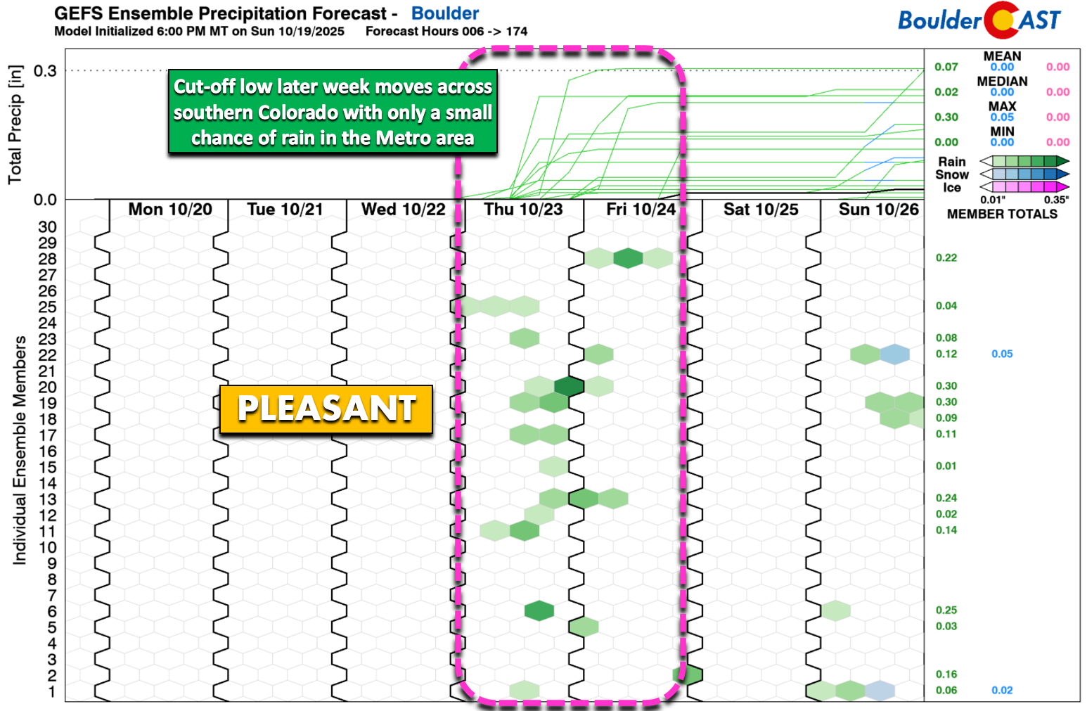 After Monday’s storm zips east, we settle into a calmer stretch Tuesday through Thursday. A ridge builds in, bringing sunny skies and highs in the mid to upper 60s, a pleasant rebound. By late Thursday, a cut-off low may drift in from the southwest. It’s small, warm, and weak, and current model trends keep most of its rain south of Boulder and Denver.