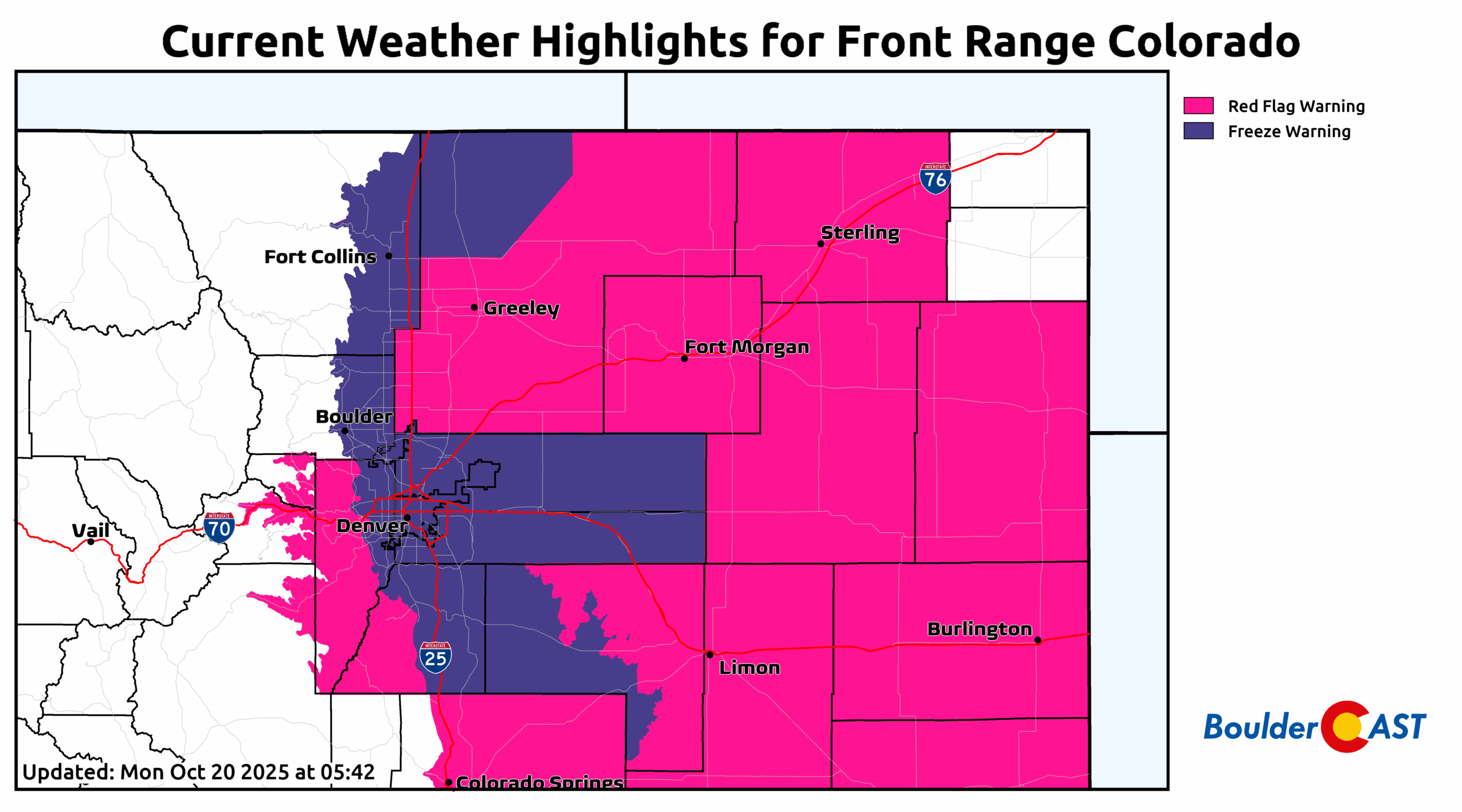 This week’s forecast is anything but boring in the Front Range. A fast-moving autumn storm is stirring up the atmosphere on Monday with jet-driven Mountain snow, powerful downslope winds, and a fire-weather setup that demands caution. And once the winds die down? A hard freeze will slam the door on the growing season for the entire area Monday night. Read on for a full breakdown of the very active weather unfolding in Colorado on Monday, plus a peek towards the quieter days ahead.