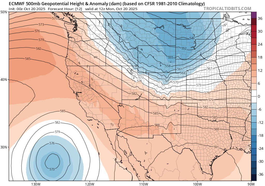 Euro 500mb height anomaly forecast for Monday through Friday showing the early week trough exiting, the midweek ridge, and the cut-off low late-week.
