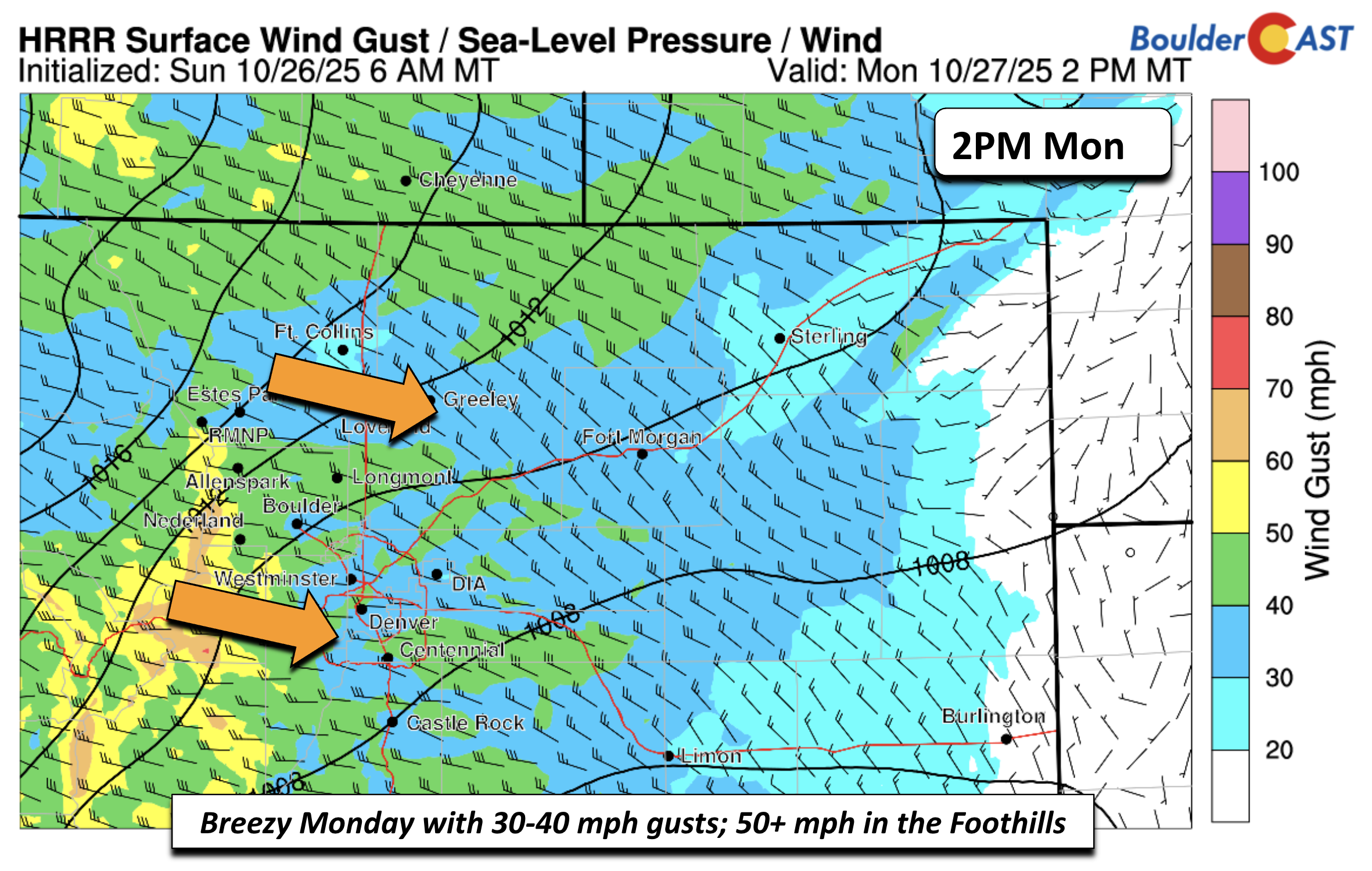 - 🌬️ Windy Monday: Breezy conditions kick in mid-morning with gusts up to 40 MPH on the Plains and 50+ MPH in the Foothills. Mind the crosswinds if you’re driving north-south!