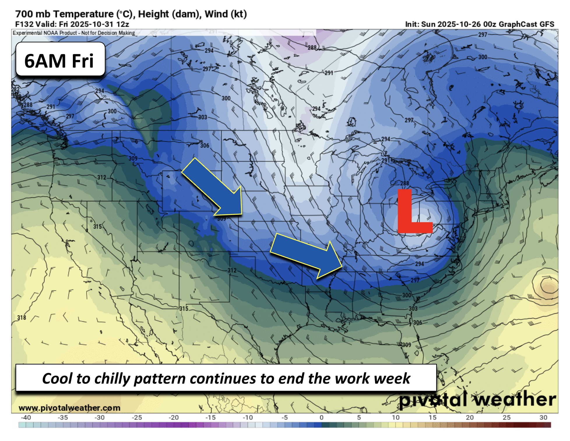 - 🎃 Halloween = Chilly but Calm: Friday stays dry with highs in the 50s and evening trick-or-treat temps dipping into the 40s or upper 30s.