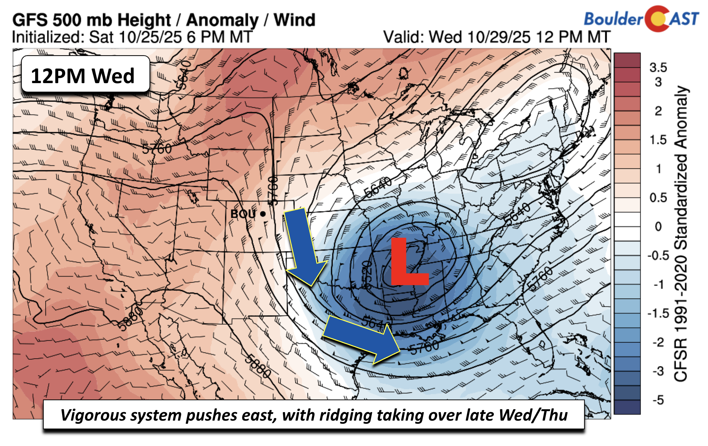 By Wednesday, the upper trough shifts east into the Mississippi Valley. Northerly flow will keep things cool, but a ridge begins to build late Wednesday into Thursday. That’ll quiet things down across the Front Range. Highs Wednesday and Thursday should rebound into the mid-50s — still below average, but a step in the right direction.