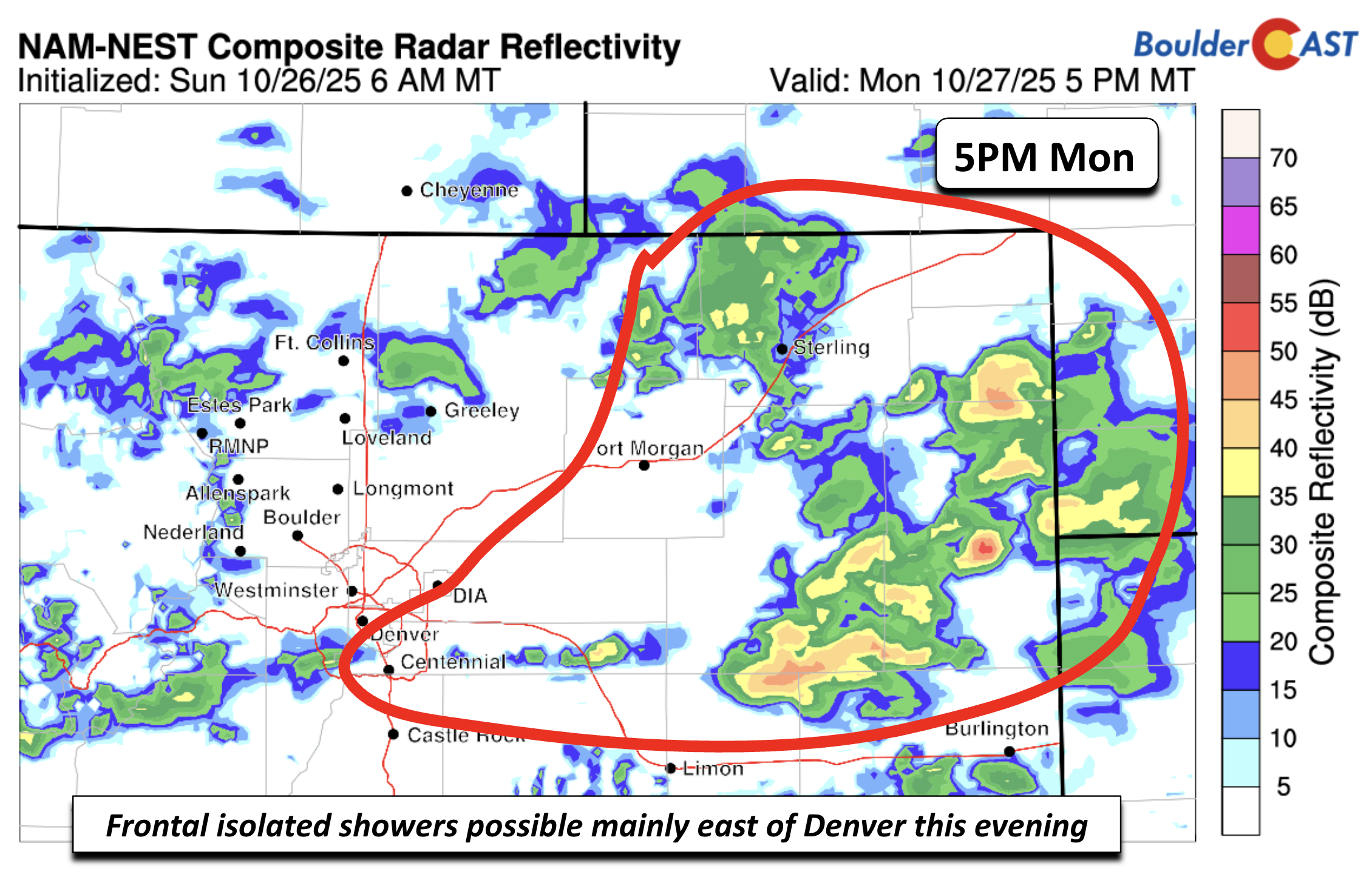 A sharp cold front will barrel through the Boulder–Denver area early Monday evening. Temps will tumble into the 40s by late evening and bottom out in the upper 20s by Tuesday morning. Between 4–8 PM, expect scattered light showers, mainly east of I-25 where downslope suppression will be less of a factor. Some embedded thunder is possible closer to the Nebraska/Kansas border, where instability will be higher.