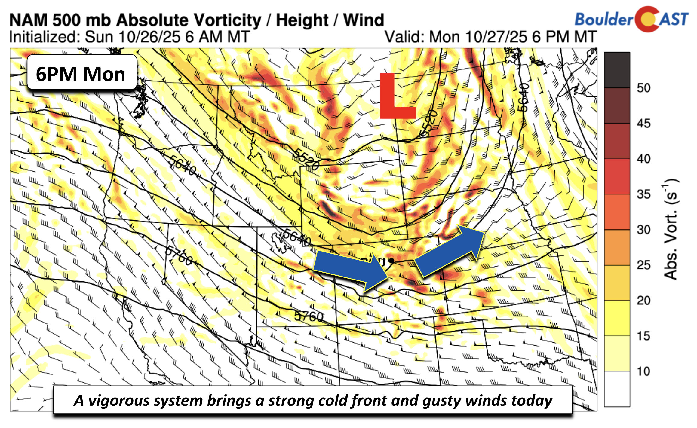 We’re kicking off the week with a dynamic weather setup, thanks to a robust upper-level trough spinning over eastern Montana and the northern Plains. This system is set to stir up breezy conditions, light snow in the High Country, and even a few stray thundershowers across the eastern Plains. And yes—get ready for cold weather. This system is packing the coldest air we’ve seen so far this fall.