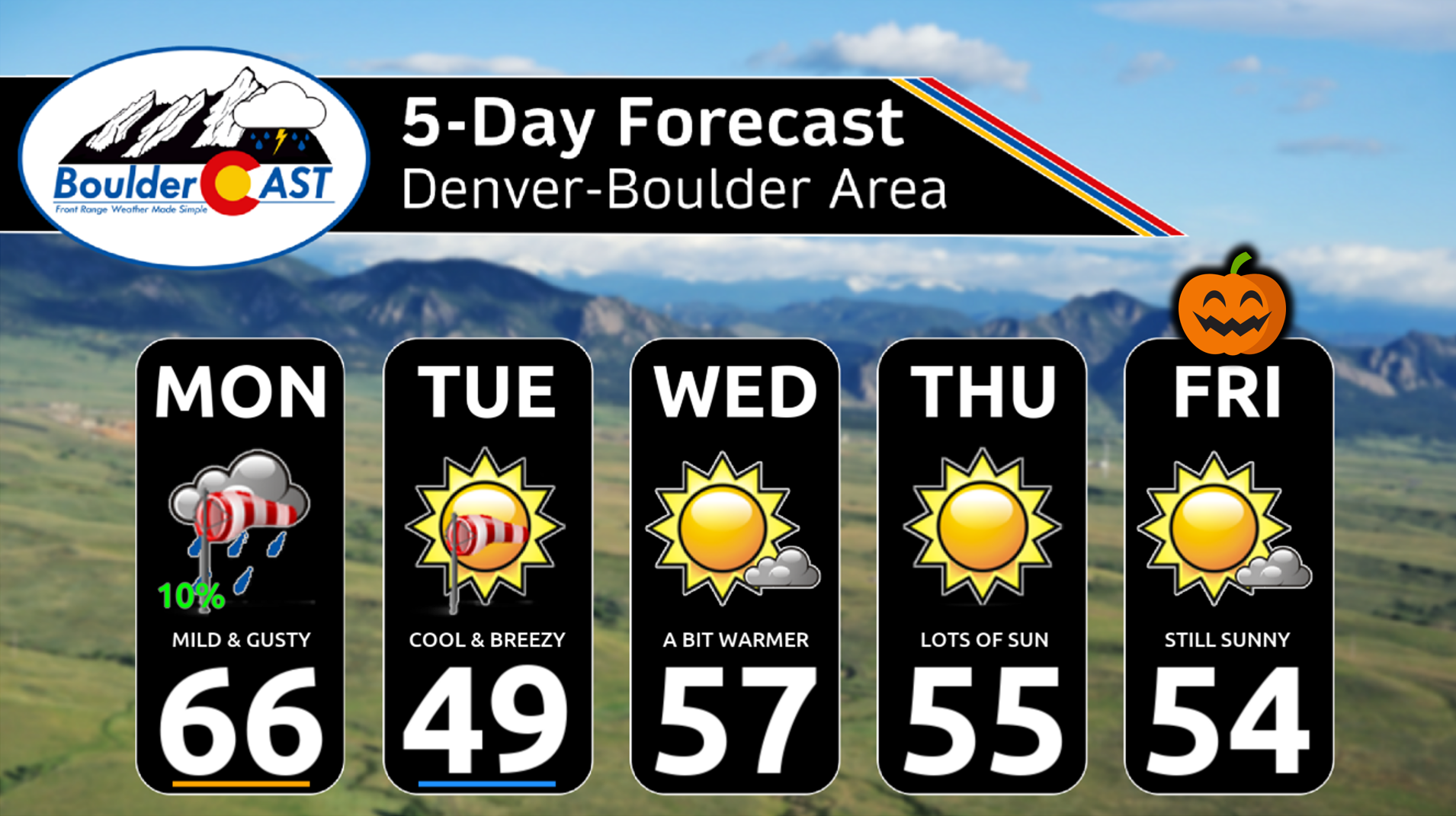 Bundle up and brace for an eventful week of fall weather across the Front Range as temperatures turn colder! Gusty winds and even a few thundershowers on Monday will precede a frontal boundary set to bring the season’s coldest air yet. Read on for all the details of the week ahead, including a discussion of nightly hard freezes, the Halloween forecast, and a weekend warm-up that might just make you forget it’s the start of November…
