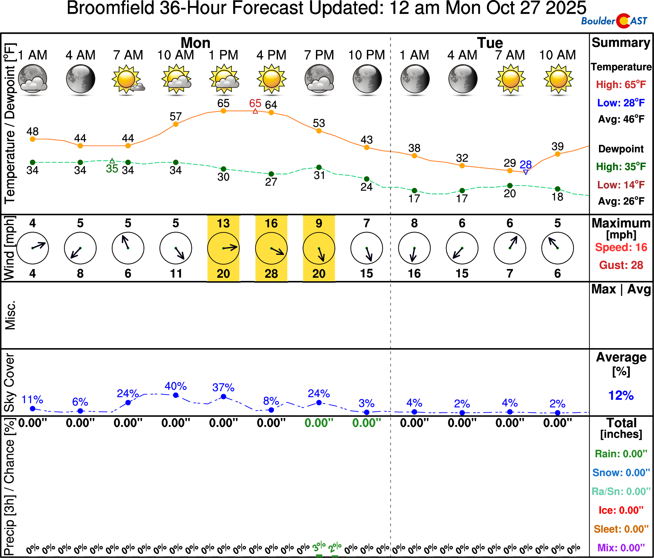 Tuesday: Mostly sunny and fairly chilly with mid/upper 40s over the Plains and middle/upper 30s in the Foothills. Gusty winds of up to 25 MPH in the afternoon. Lows Tuesday night very cold in the lower 20s as the entire Front Range experiences a hard freeze.