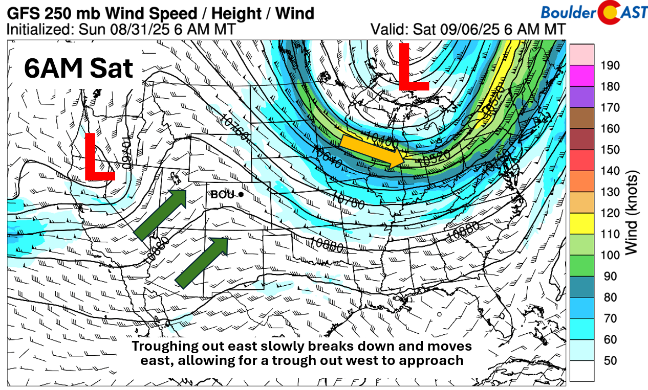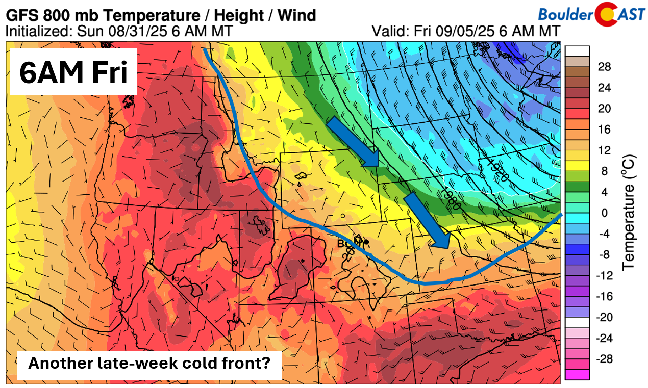 - Midweek Trough & Cold Front: A glancing trough brushes eastern Colorado Wednesday, nudging a weak cold front through Boulder-Denver. Slight cooling and a bump in storm chances possible, but impacts look minimal.