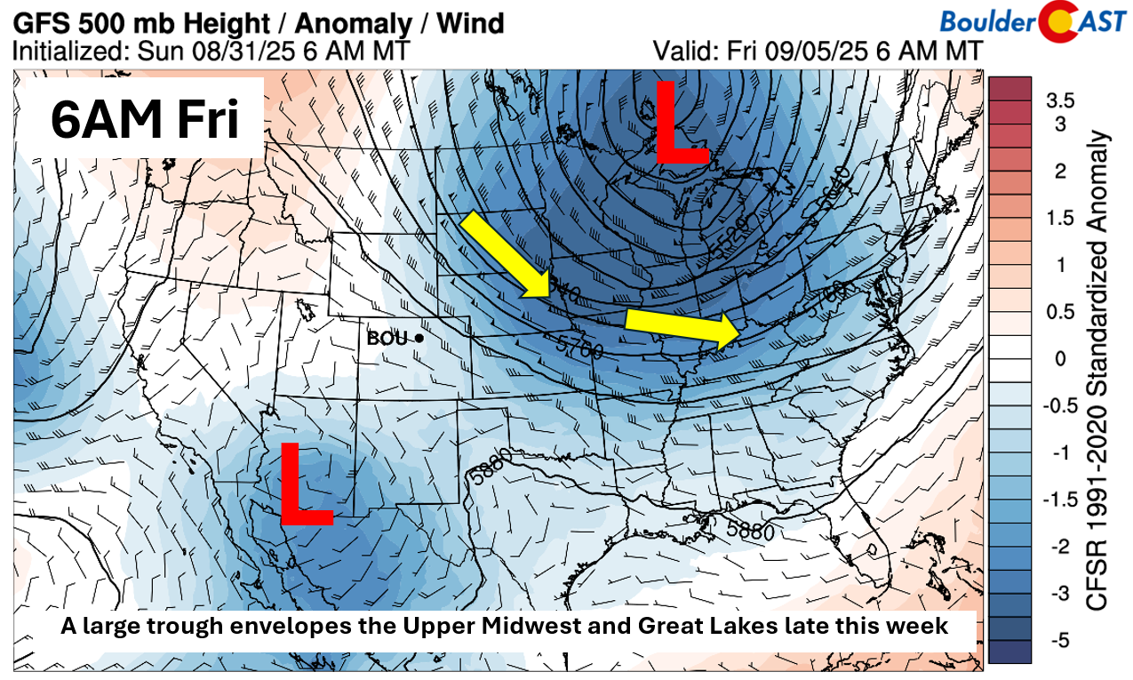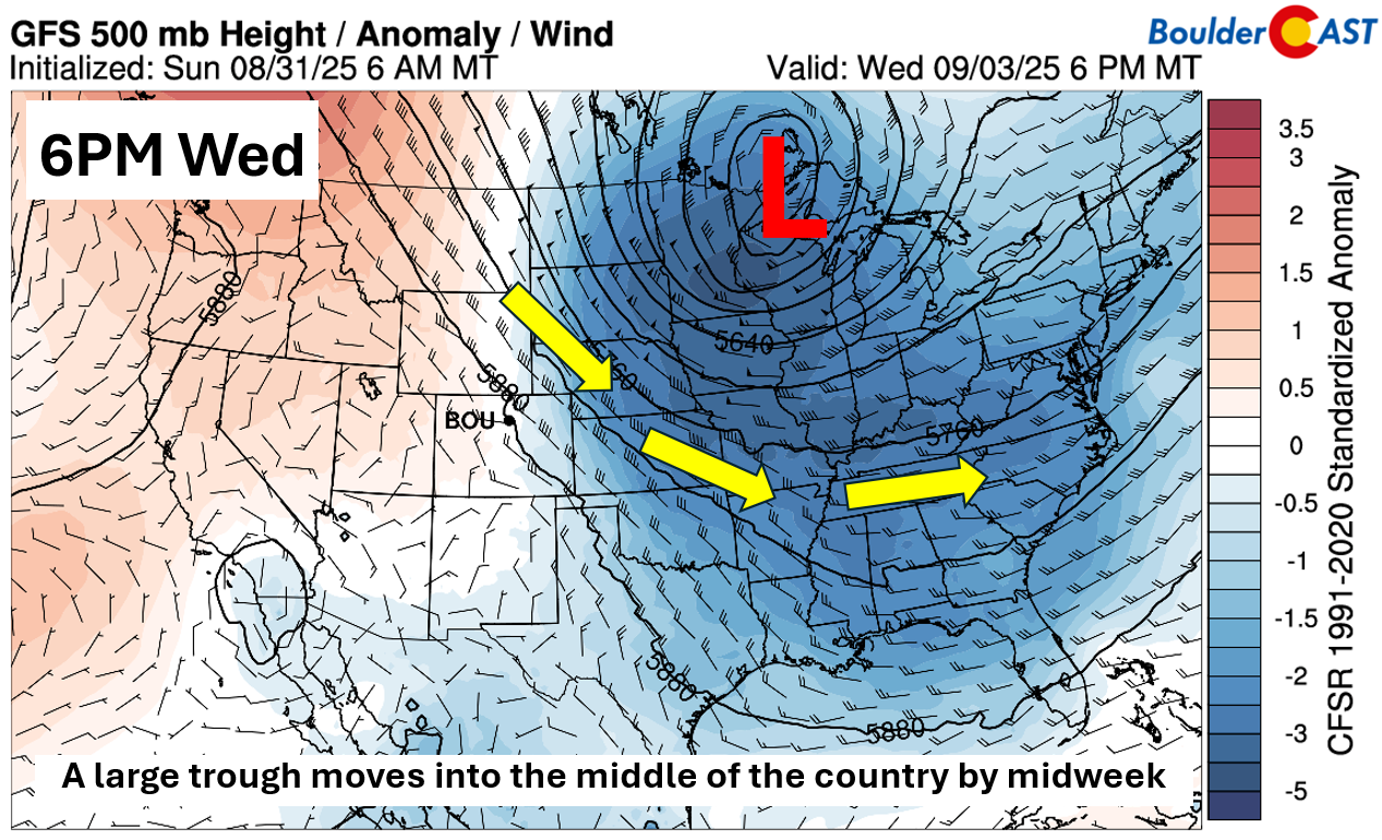 Deep troughing will start to play a role by mid to late week. The first in a series of troughs drops into the Midwest and Great Lakes by Wednesday, with its western edge brushing eastern Colorado.