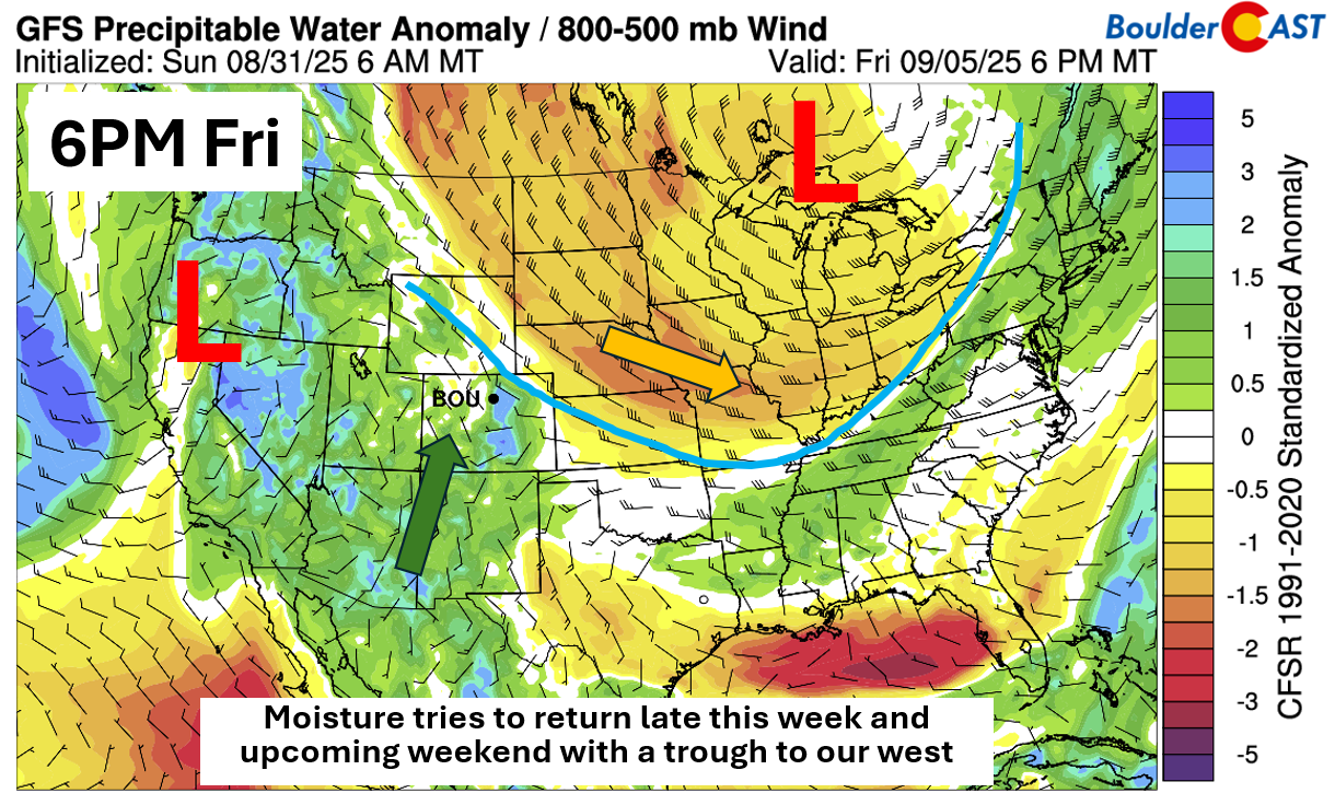 Friday’s setup is a bit of a hinge point. The front looks to drape right along the Front Range, with a pocket of anomalous moisture just to our west. If that moisture surges eastward faster — as the GFS is currently hinting — we could see better rain chances Friday than we’re projecting right now. Either way, moisture should be on the upswing by the weekend if the current pattern holds.