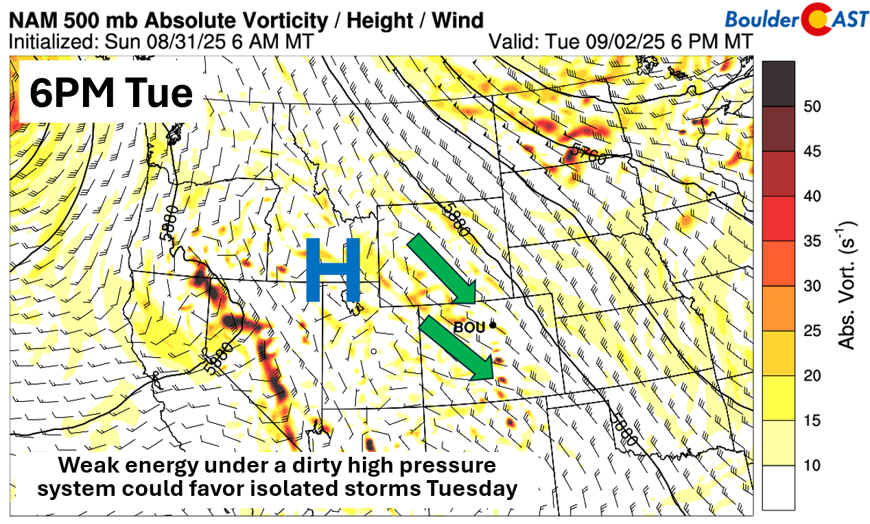 High pressure kicks off the week. A ridge centered over Utah will dominate through Tuesday, though guidance suggests some weak mid-level energy sneaking southeast Tuesday afternoon and evening. Moisture is limited, so any convection should stay confined to the higher terrain. Still, we wouldn’t rule out a rogue shower or storm near the Foothills.