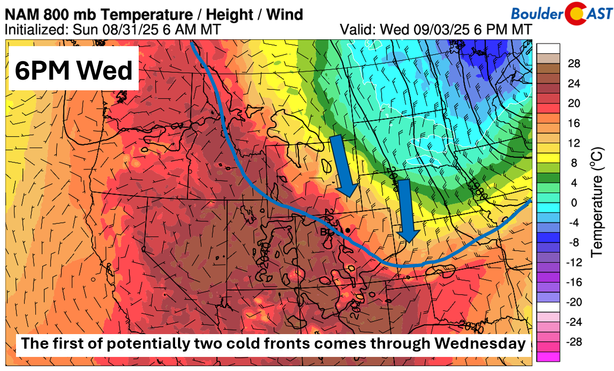 The glancing trough will be enough to push a weak cold front through the Boulder-Denver area sometime Wednesday evening. Ahead of it, we’ll likely stay in the middle 80s, but if the front speeds up, upper 70s are on the table. It could also bump up storm chances slightly late Wednesday, though we’re not expecting much at all.