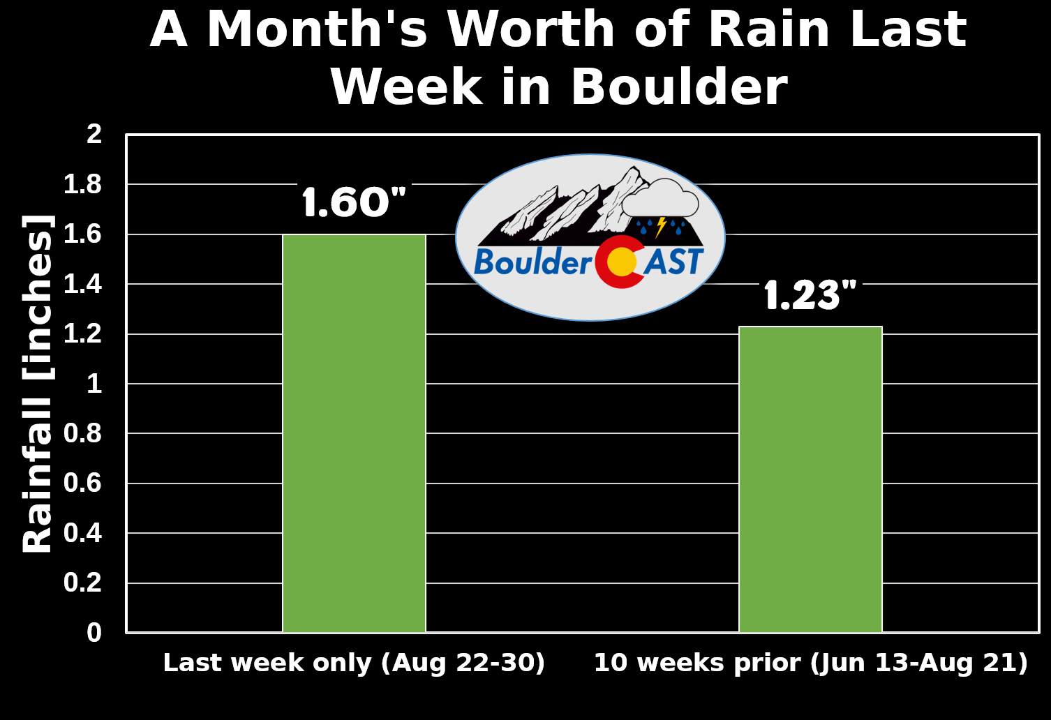 We don’t yet have the official rainfall totals from Boulder last week owing to a few days of missing data, but around 1.60″ accumulated in the city between August 22nd and 30th. This is the amount of rain we typically receive throughout the full month of August, so the week-long stretch of rain and gloom was definitely abnormal for this time of year.