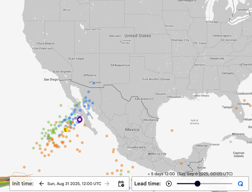 However, this track is far from certain five days out. Google’s experimental AI model, paired with ECMWF ensemble data, allows us to explore possible tracks — notice that the spread is rather wide, ranging from landfall in Mexico to the storm fizzling out well offshore.