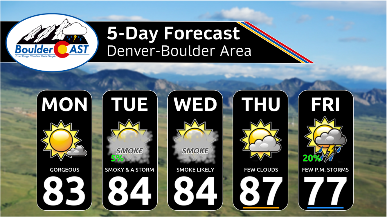 - Mellow Start, Smoky Skies: High pressure dominates early week with seasonal temps in the low to mid 80s. Wildfire smoke from the Pacific Northwest and western Canada may drift into the Denver Metro by Tuesday.