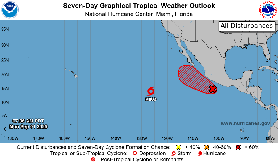 Tropical moisture is on the radar by the weekend, but confidence is low. There’s some credence for a tropical system near the Baja potentially influencing our setup late this weekend or early next week, shown as the red “X” below: