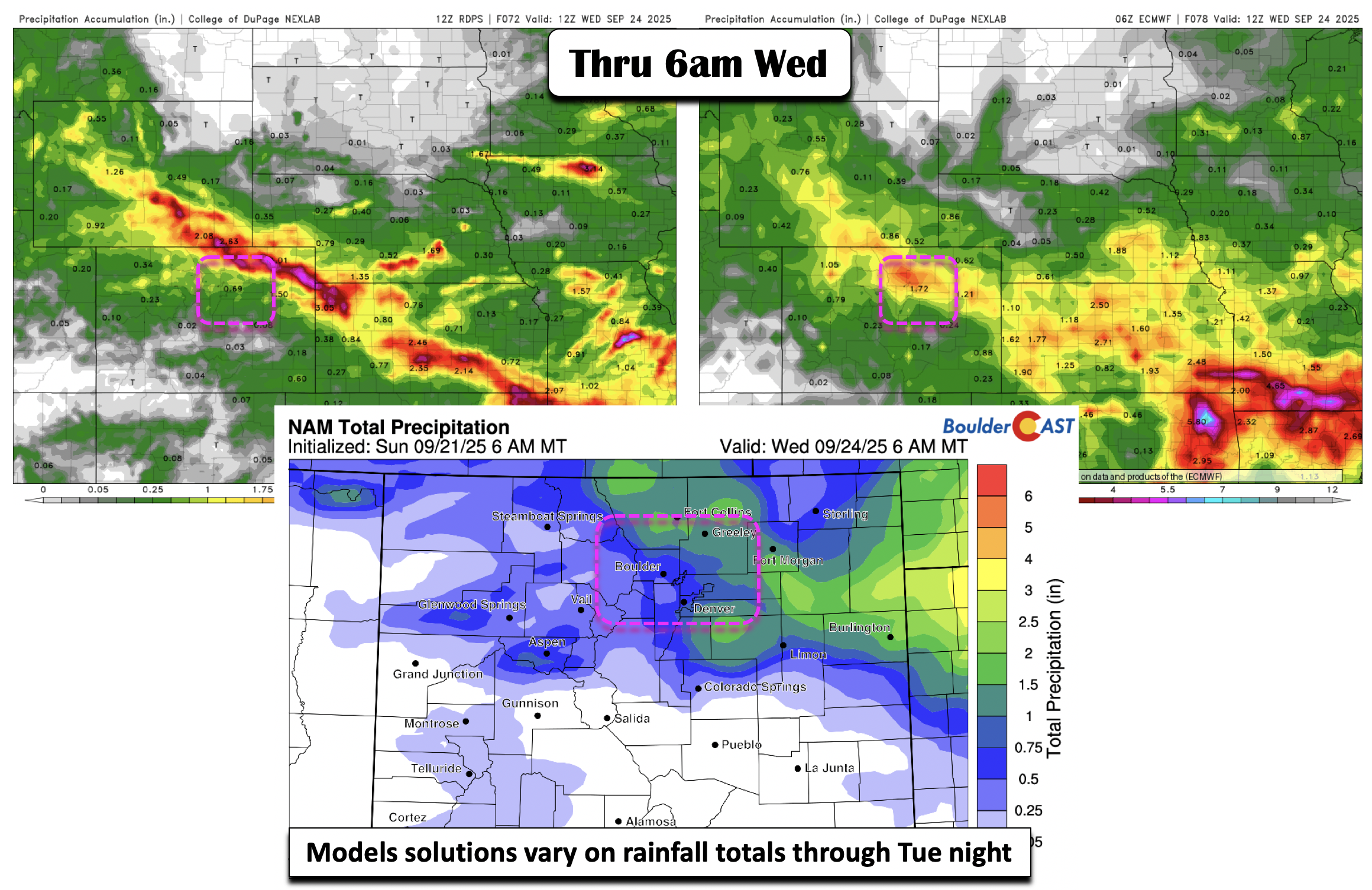 Models are split on where the heaviest rain will fall. Some place it just north and east of Denver/Boulder, while others (like the ECMWF) bring it right over the Front Range. The NAM model lands somewhere in between. Regardless, most areas should see between 0.5″ and 1″ of rain. There’s even a chance some spots could pick up 1.5″ to 2″+, though that’s less certain. Because of this, the Weather Prediction Center has issued a marginal risk for excessive rainfall.