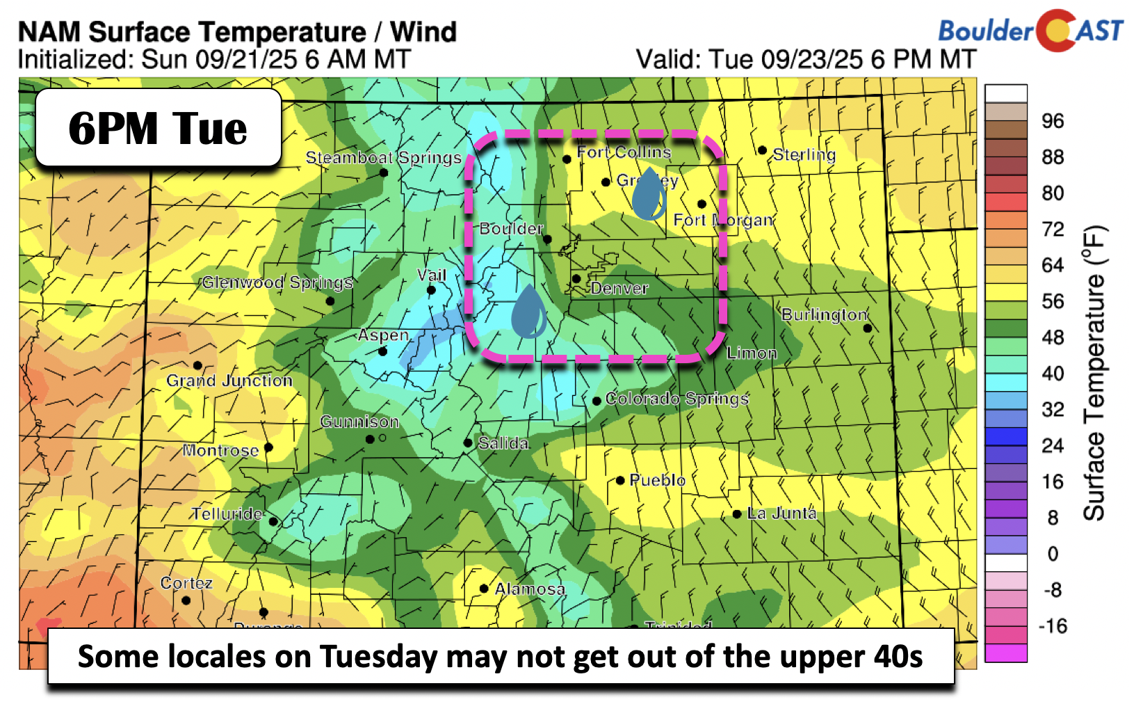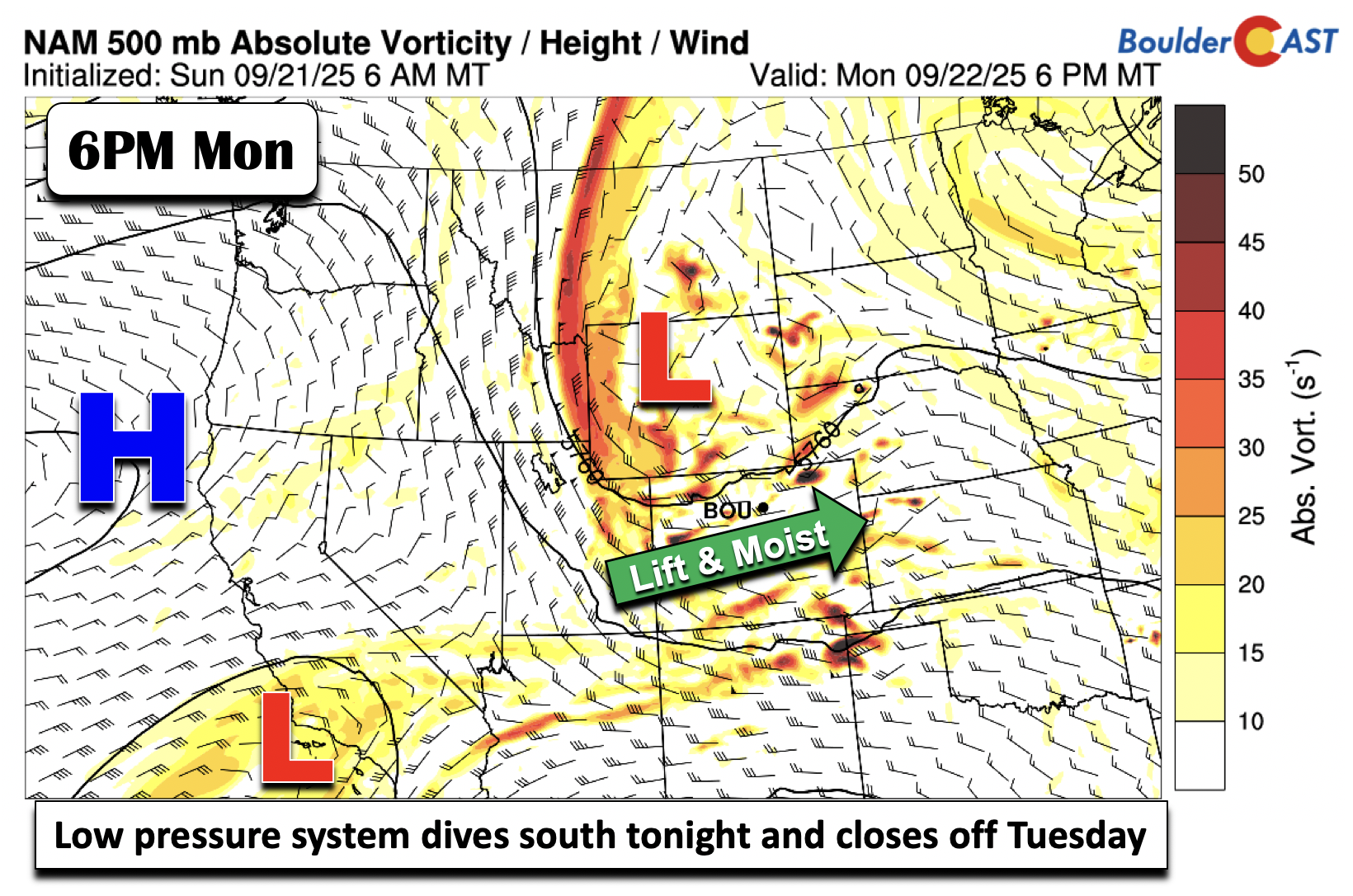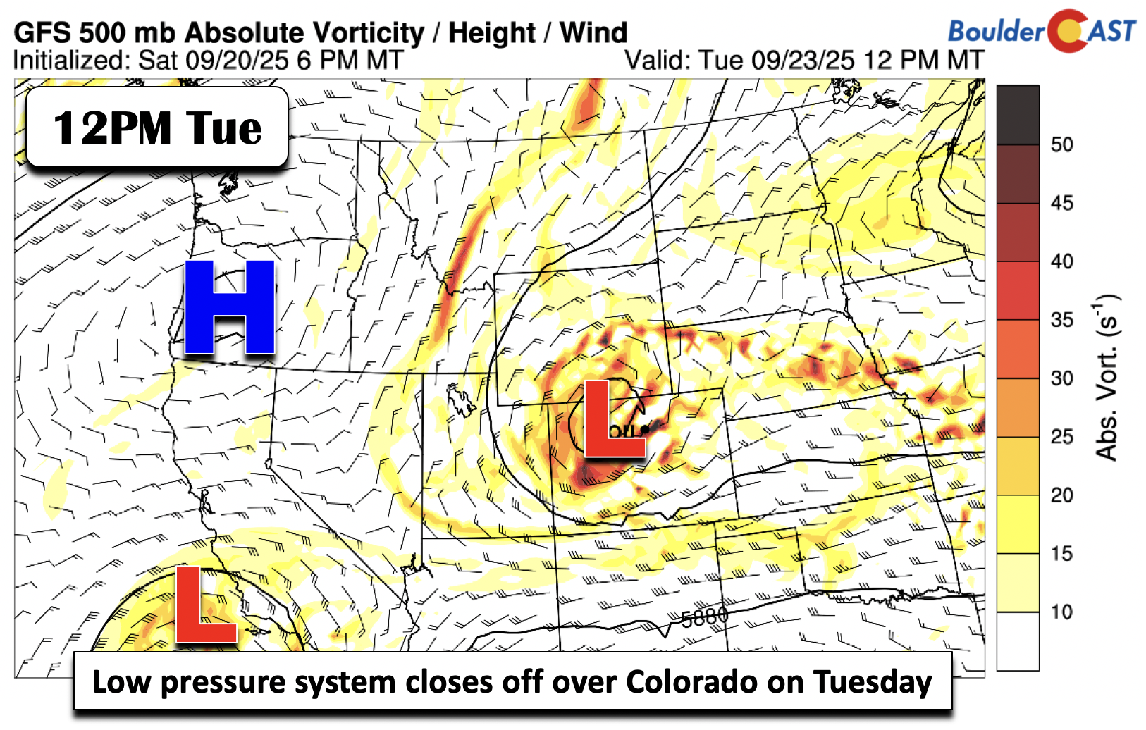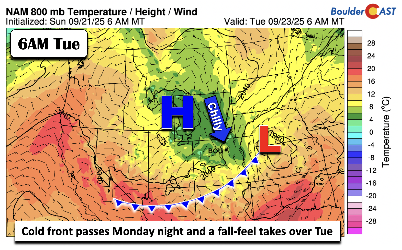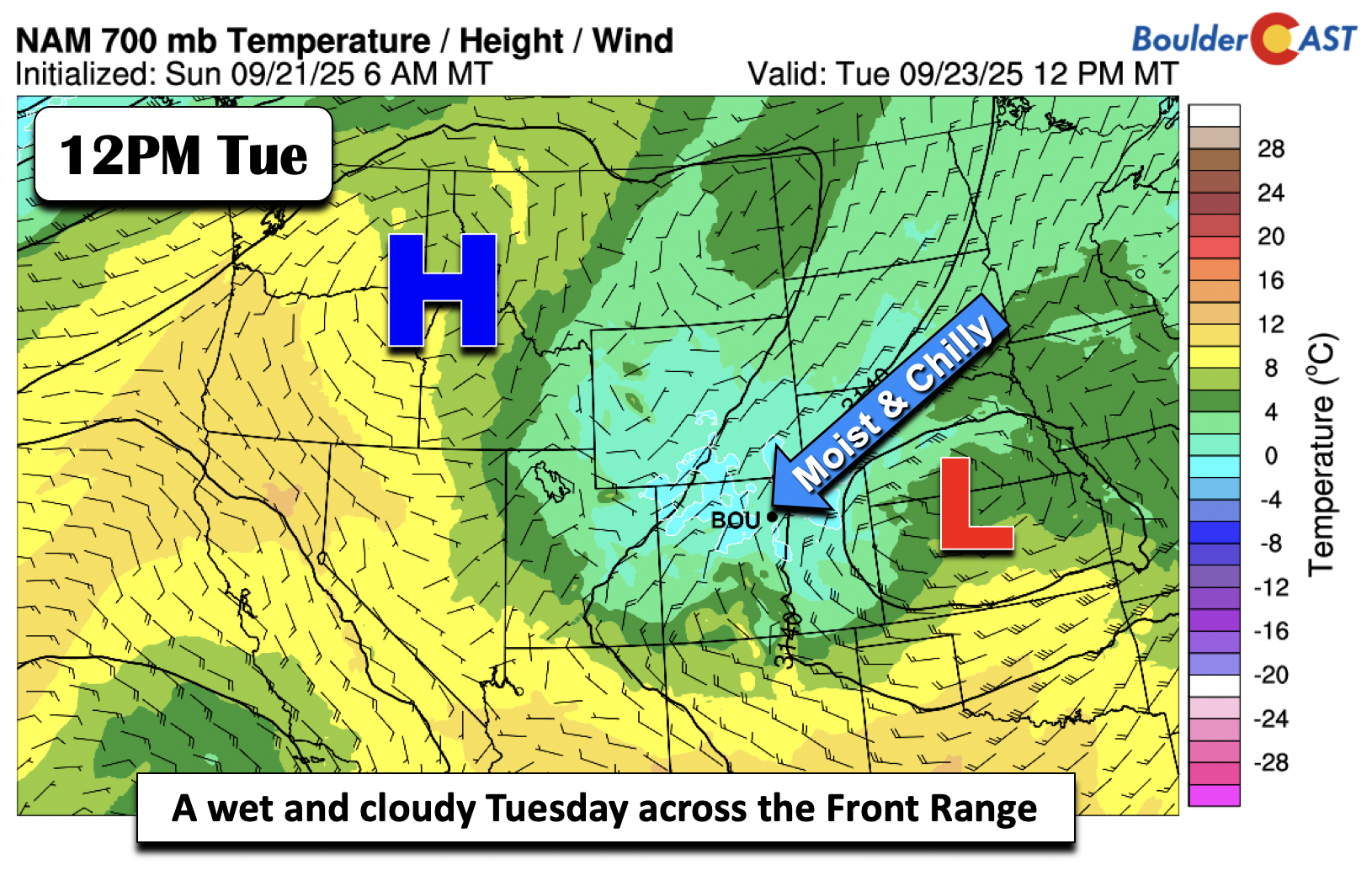 🌧️ Stormy Start: A mid-level circulation dropping in from Wyoming will trigger rain, chilly temps, and even High Country snow through Tuesday, with a surface low and strong cold front enhancing the impact.