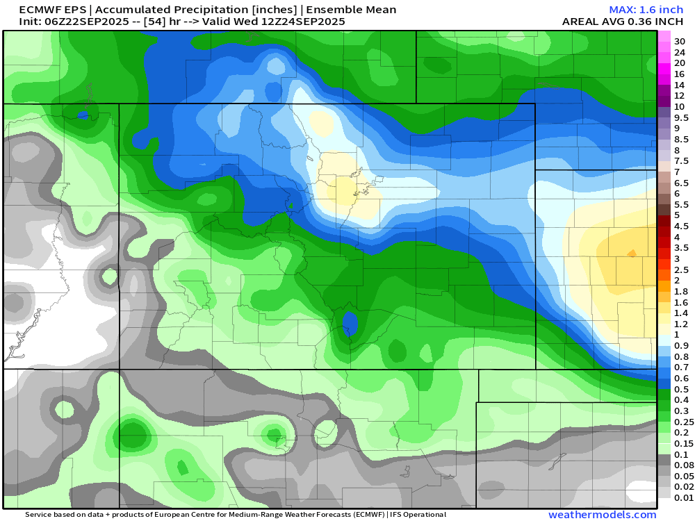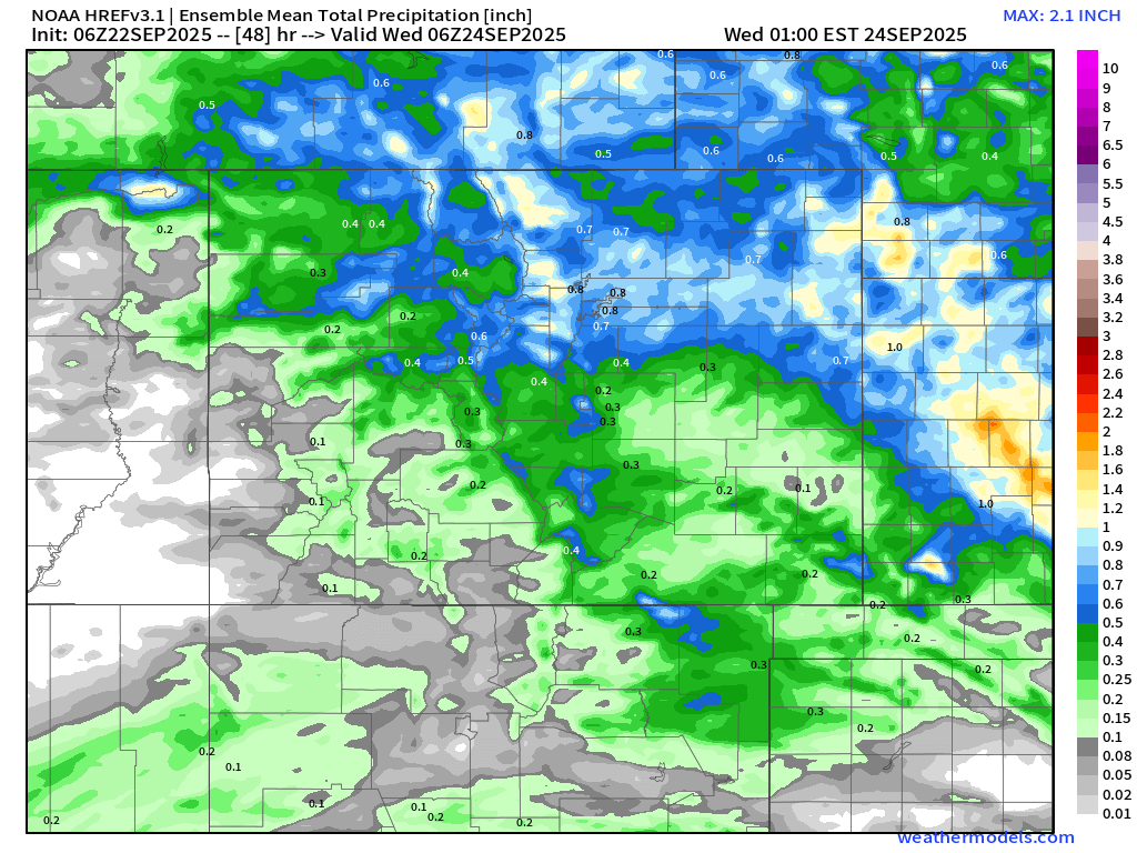 Rain chances pick up this afternoon, with scattered to widespread showers moving west to east from the mountains onto the Front Range. The prime window for this activity is between 2PM and 10PM. Most areas will see between 0.10″ and 0.25″ of rain, though some spots could get a bit more or less. Severe weather isn’t expected locally, as the instability axis stays east near the Colorado-Kansas border.