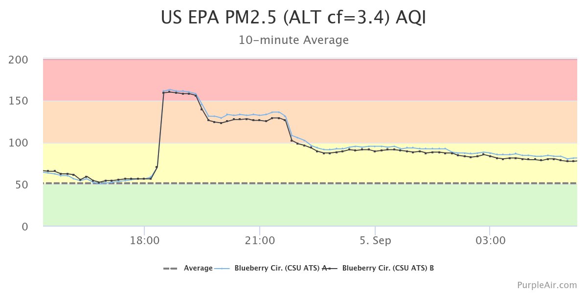 Timeline of PM2.5 air quality from Fort Collins last Thursday evening. The worst 150+ AQIs only lasted 1-2 hours.
