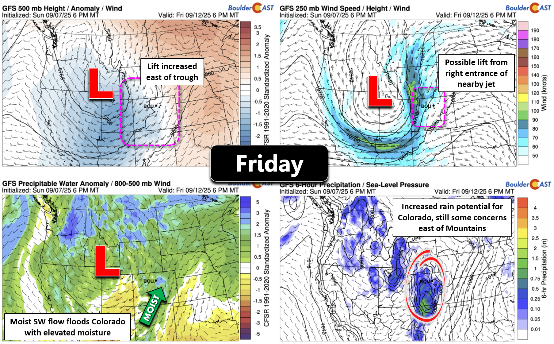 Friday: Likely the best chance of rain for the week as a trough passes nearby. Widespread storms are expected in the Mountains, with scattered late-day storms for the Boulder-Denver area. Storms will still be limited by low-level moisture making rainfall potential not great and outflow winds still the big concern. Highs drop to near 80° on the Plains with upper 60s in the Foothills.