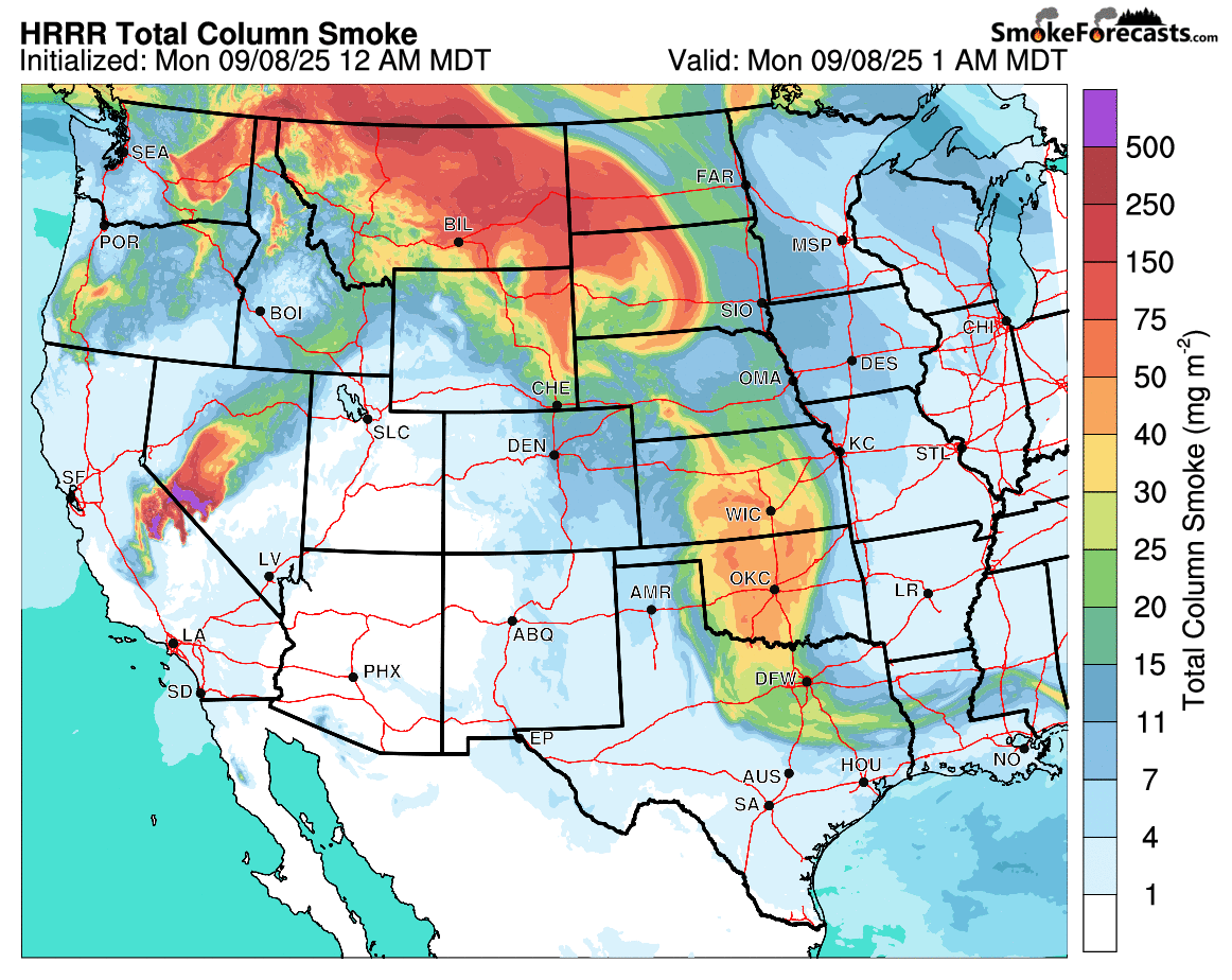 Smoke forecast for Monday and Tuesday. Colorado remains mostly clear due to SW flow keeping the smoke at bay.