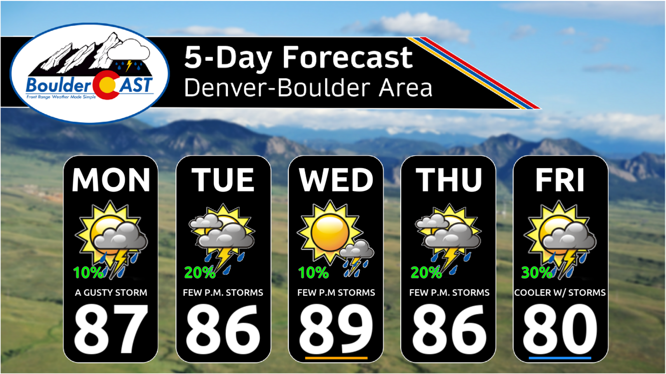 Overall, it will be a fairly warm week with just low-end storm chances. Don’t cancel any outdoor plans — just keep an eye to the sky each afternoon for the chance of a quick-hitting gusty shower or thunderstorm. The best chance of rain on any given day will be across the higher terrain of the Mountains, Foothills, and Palmer Divide.