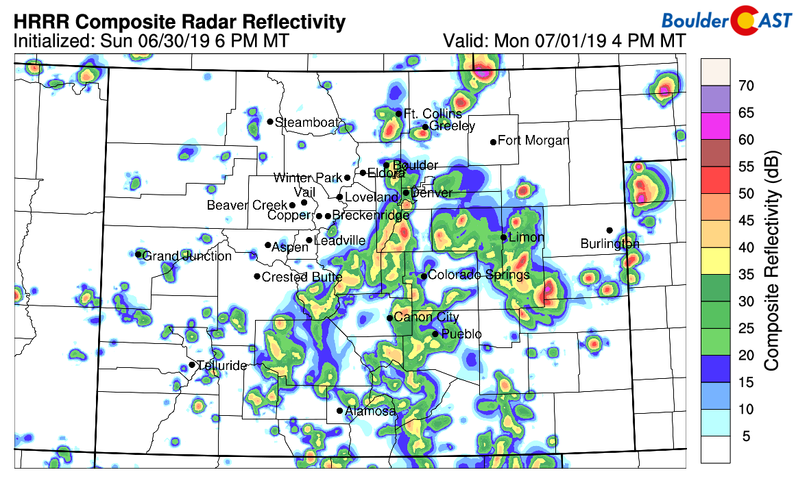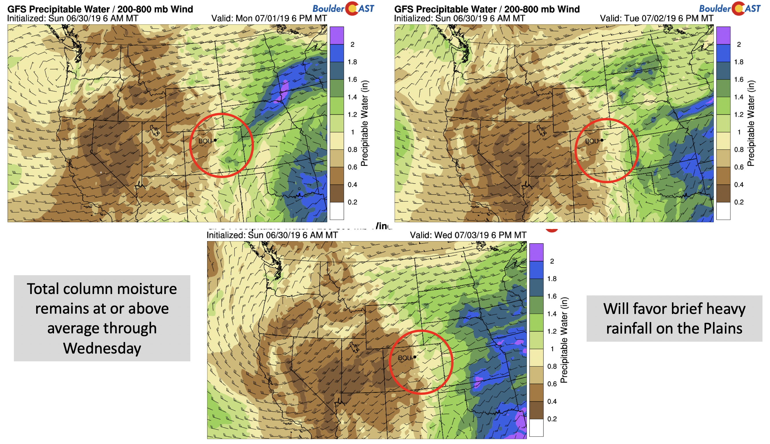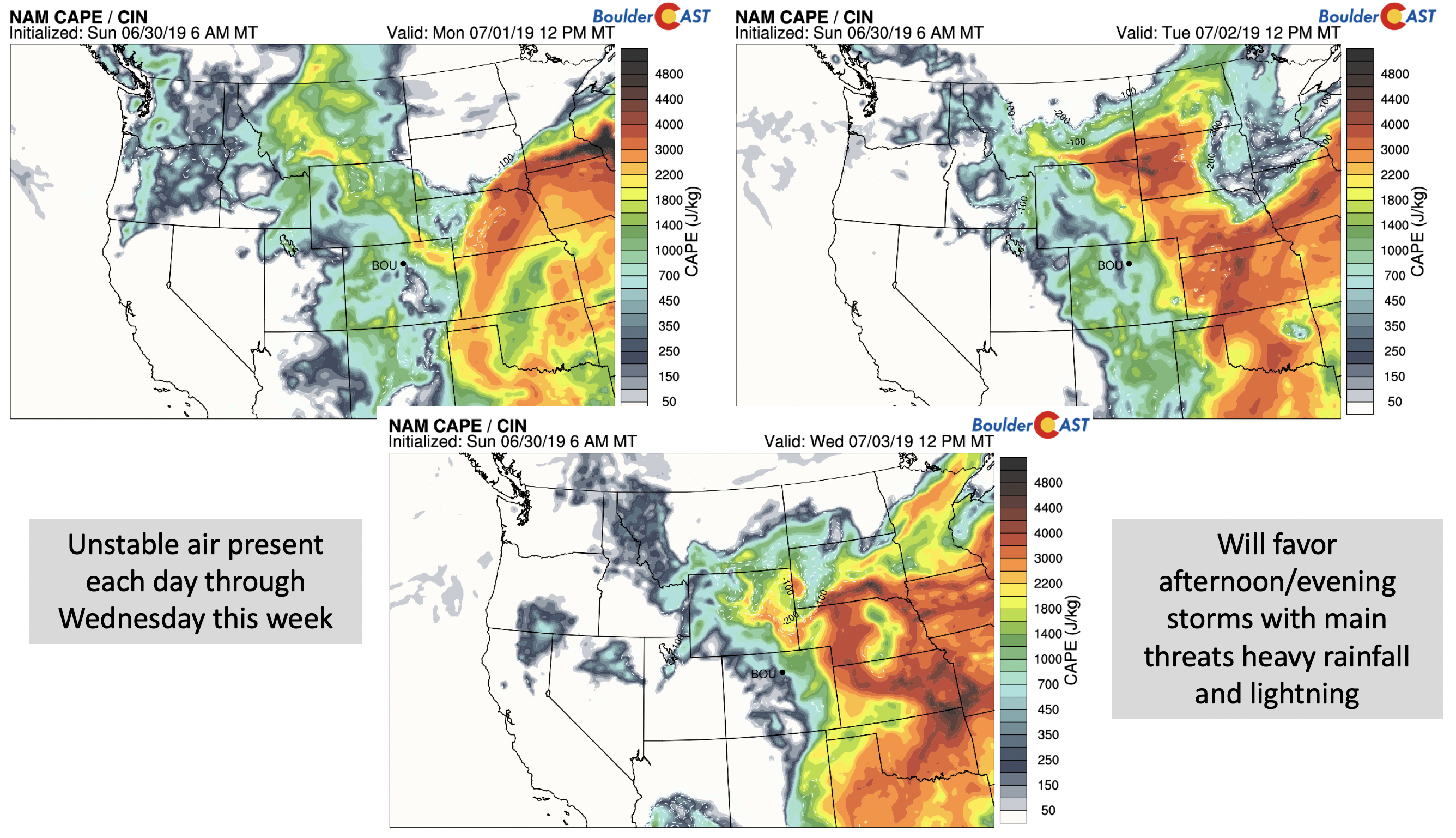 Comparable to yesterday, we’ll see afternoon/evening storms break out across the High Country and Plains. Morning clouds may slow the start of the activity in some areas. Enough daytime heating should commence by mid-day to interact with the front and allow scattered showers and thunderstorms. Given weak shear aloft, the main threats will be lightning and heavy rainfall, although isolated strong gusty winds are not out of the question. Localized flooding is a concern on Monday for sure. It is possible that the main activity will reside in southeastern Colorado with the trough axis, but this is difficult to discern given the current guidance. We’re forecasting highs in the middle 80’s with a 50% chance of storms on Monday.