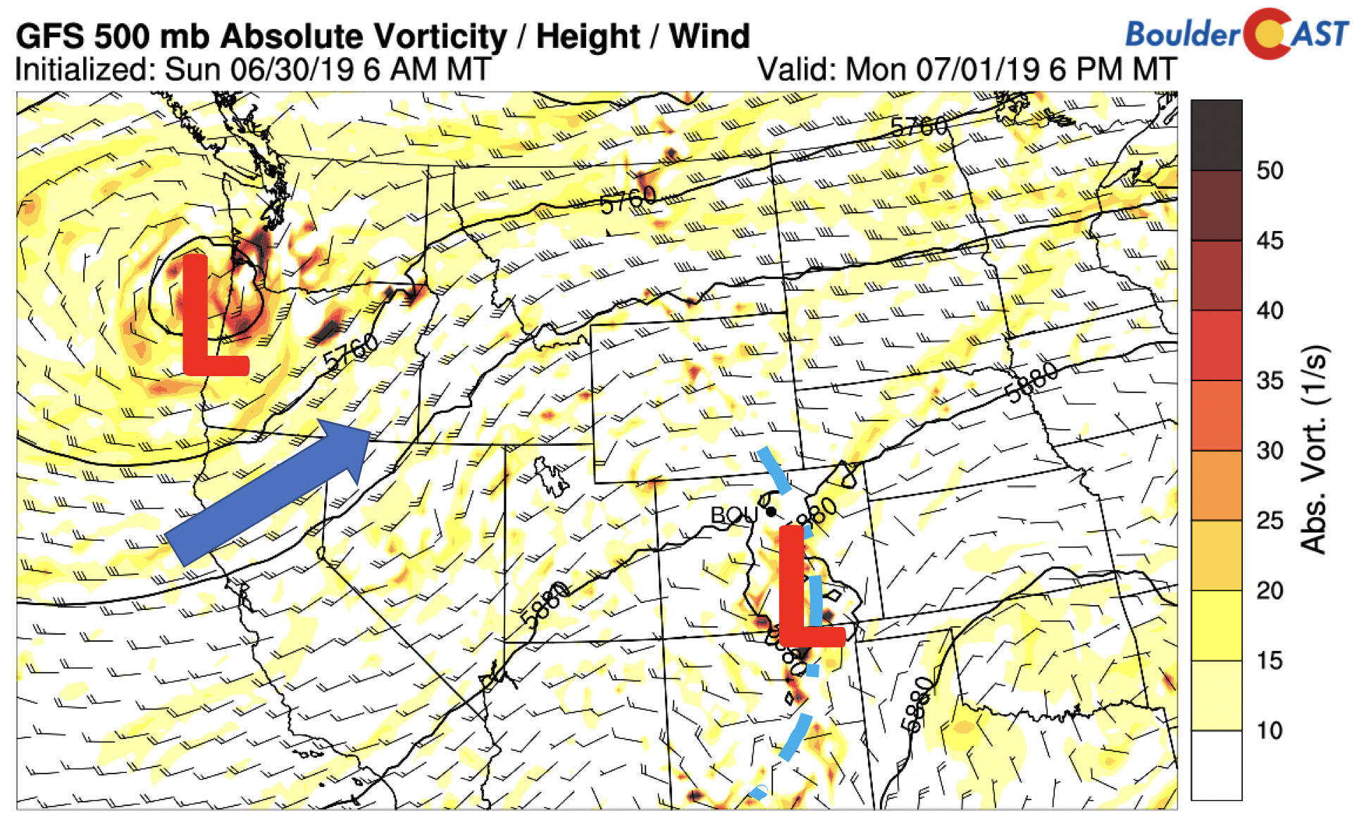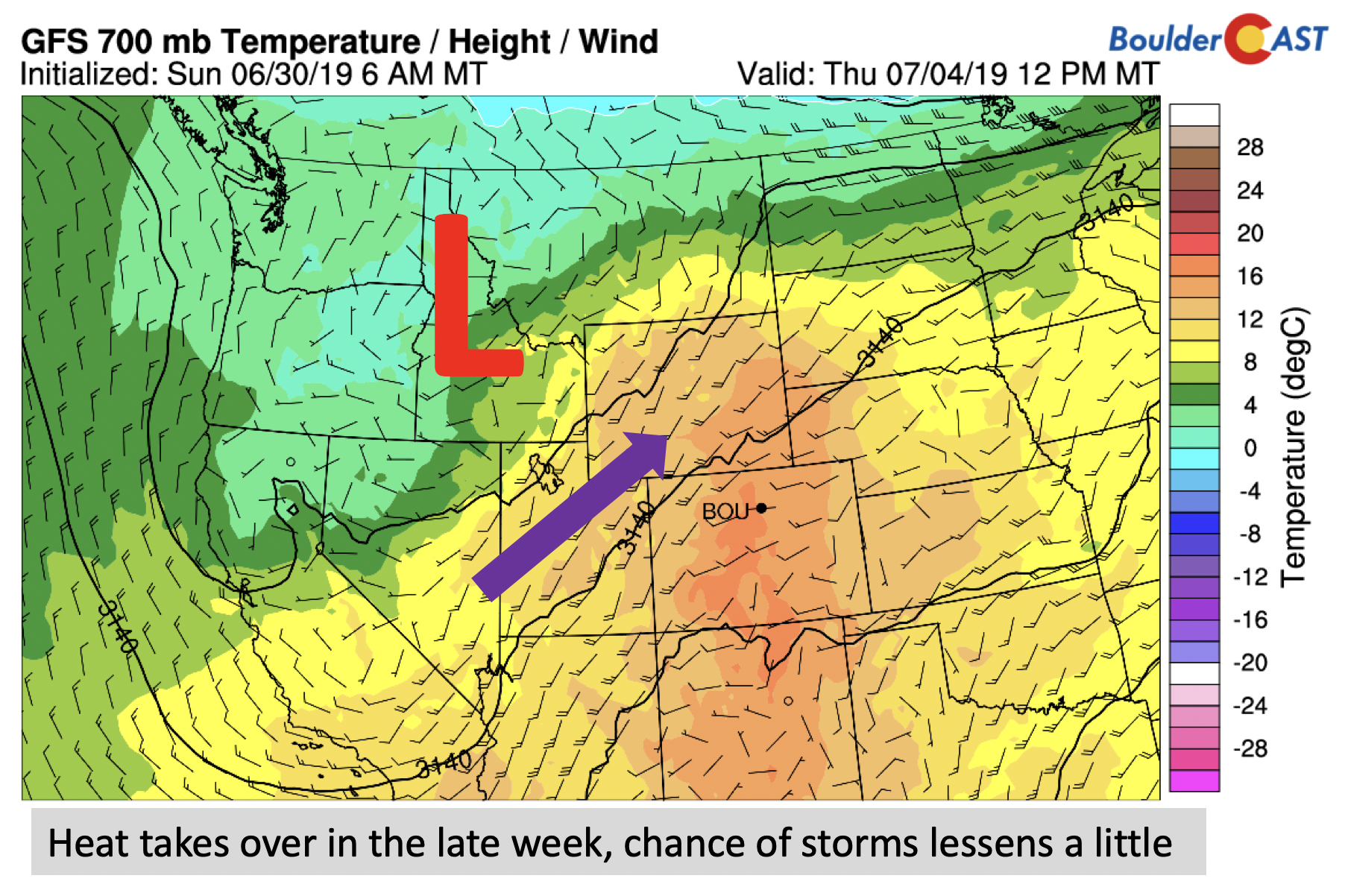 Late in the week, the aforementioned trough in the Pacific Northwest will play a slightly larger role in our overall weather pattern. Its center is projected to be over Idaho (below) by midday Thursday. That would place Colorado in the region of peak heating. There are some hints that available moisture decreases a little by Thursday/Friday as drier air works in from the Desert Southwest. However, it remains to be seen if this will verify…time will tell. Nevertheless, we see the chance of storms lessening under this pattern. That would mean an isolated nature of storm activity in contrast to earlier in the week. More sunshine would be expected as well with highs potentially getting back to near or just above 90 degrees.