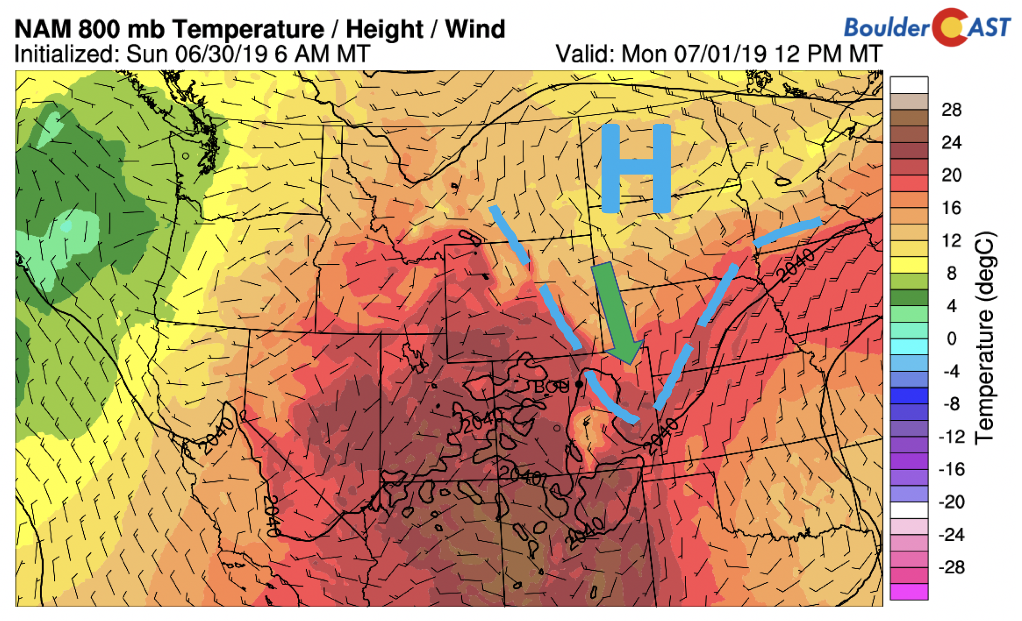 In addition the mid-level shortwave today, last night a weak cool front slid south into northeast Colorado. Its leading edge is shown below in the low-level temperature field. High pressure exists in the Dakotas, which has ushered in weak upslope flow to the region.