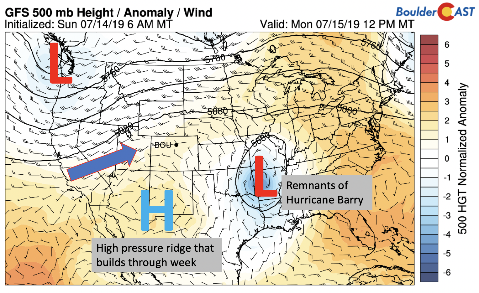 Today’s large-scale weather pattern is shown below. In the central United States are the remnants of Hurricane Barry which made landfall in Louisiana over the weekend and continues to dump heavy rain across the southern Midwest. Further west, a high pressure center is over Arizona which will build and strengthen throughout the week. To the northwest is a trough of low pressure. This low pressure and the ridge will combine this week to bring in the hottest air we’ve seen so far this summer.